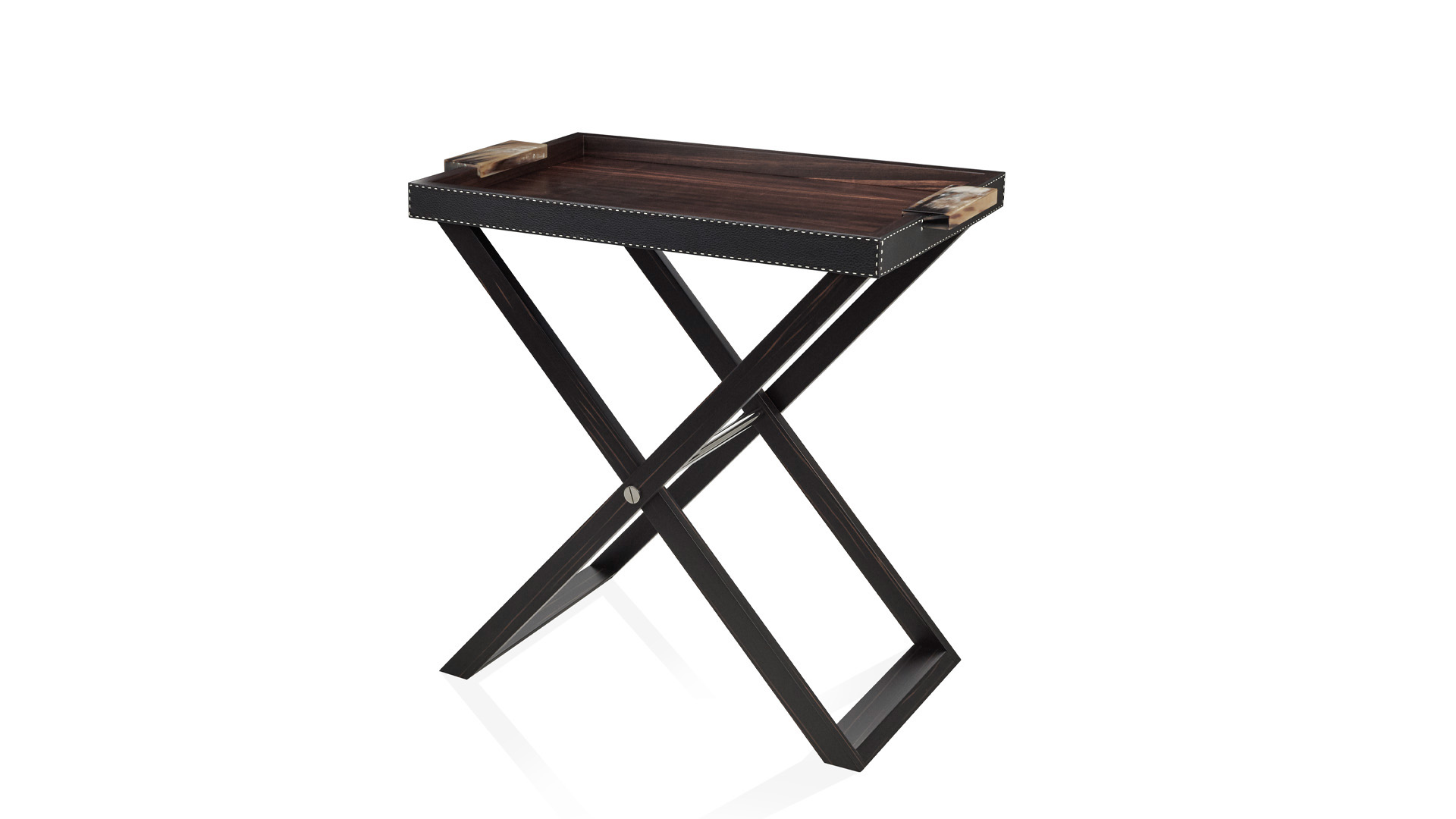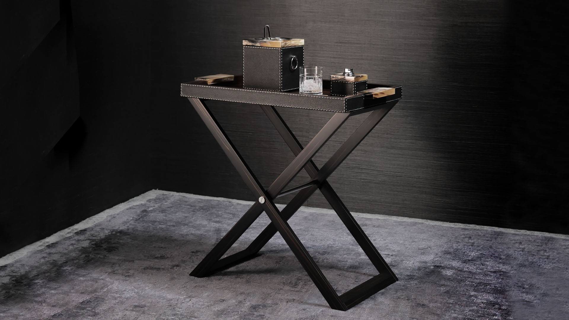 Versatile and elegant, Lipari is a butler’s tray that can be used both for serving drinks and as an extension of the side table. The tray in matte Amara ebony veneer and Aida pebbled leather, Onyx colour rests on a folding structure in wood.