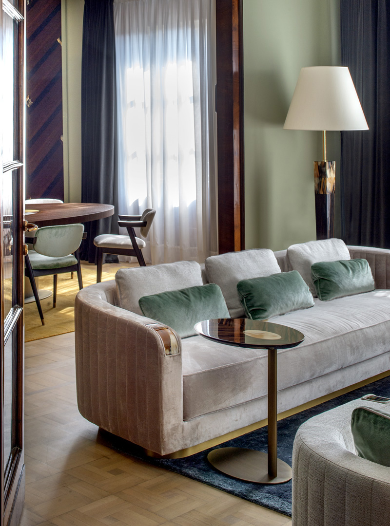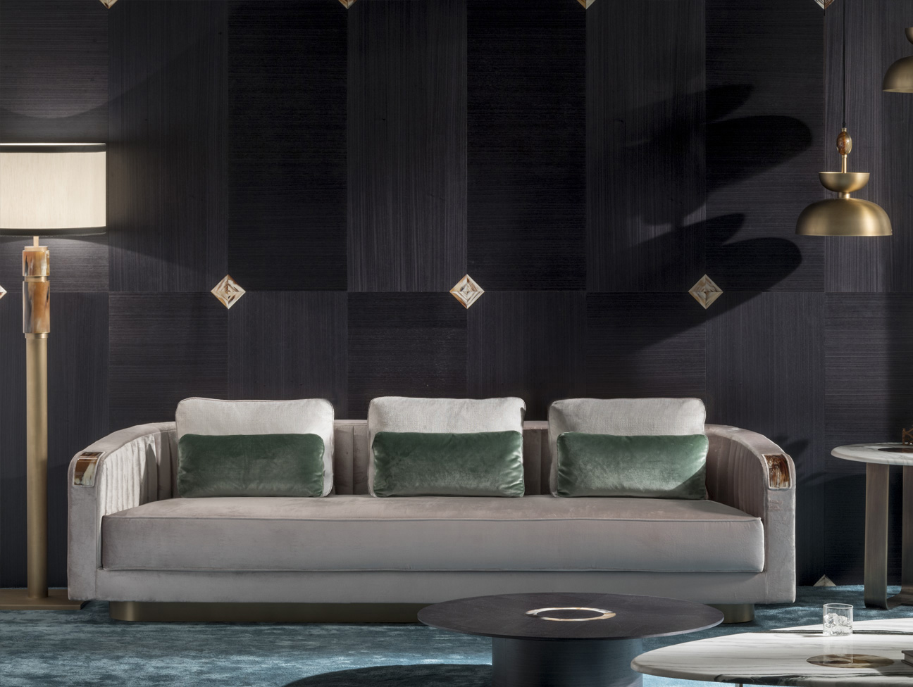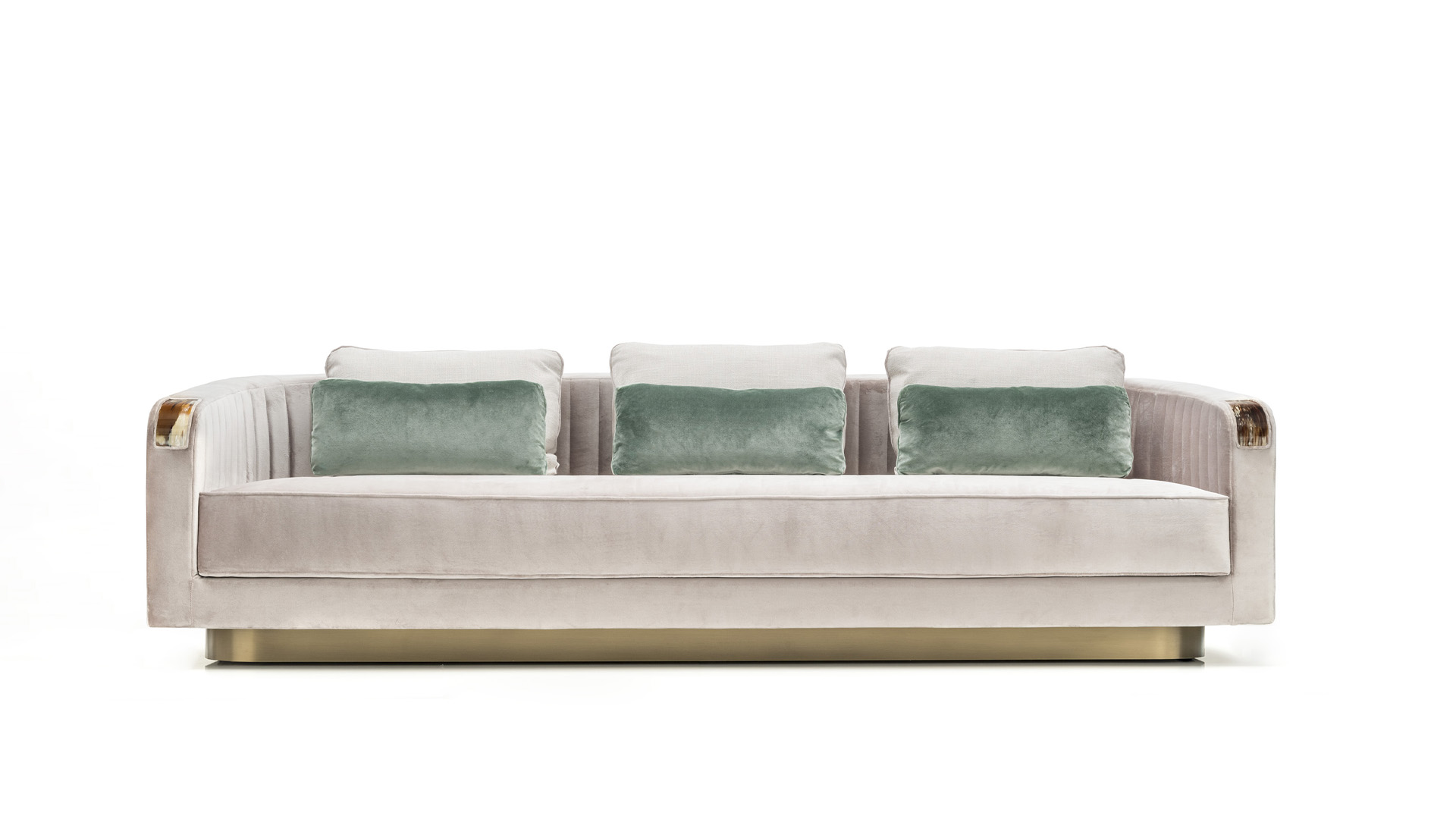 Standing out for its soft, inviting curves, the Rea 3 seat sofa bespeaks unparalleled comfort and class. Upholstered in Splendido velvet (cat. A) in a bright Silver colour, this sofa features quilted sides and back with a ribbed motif delineating its gentle lines. Unique curved horn inlays grace the sofa’s armrests and express crafts excellence at its finest. Sat atop a base in lacquered wood with satin brass effect, Rea ensures supreme comfort courtesy of the expanded polyurethane foam, goose down, and memory foam padding. Bespoke finishes and upholstery are available upon request.
