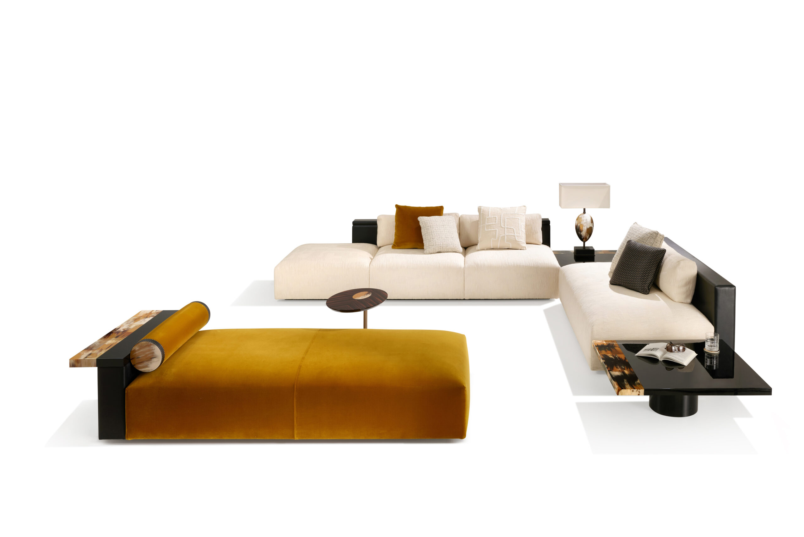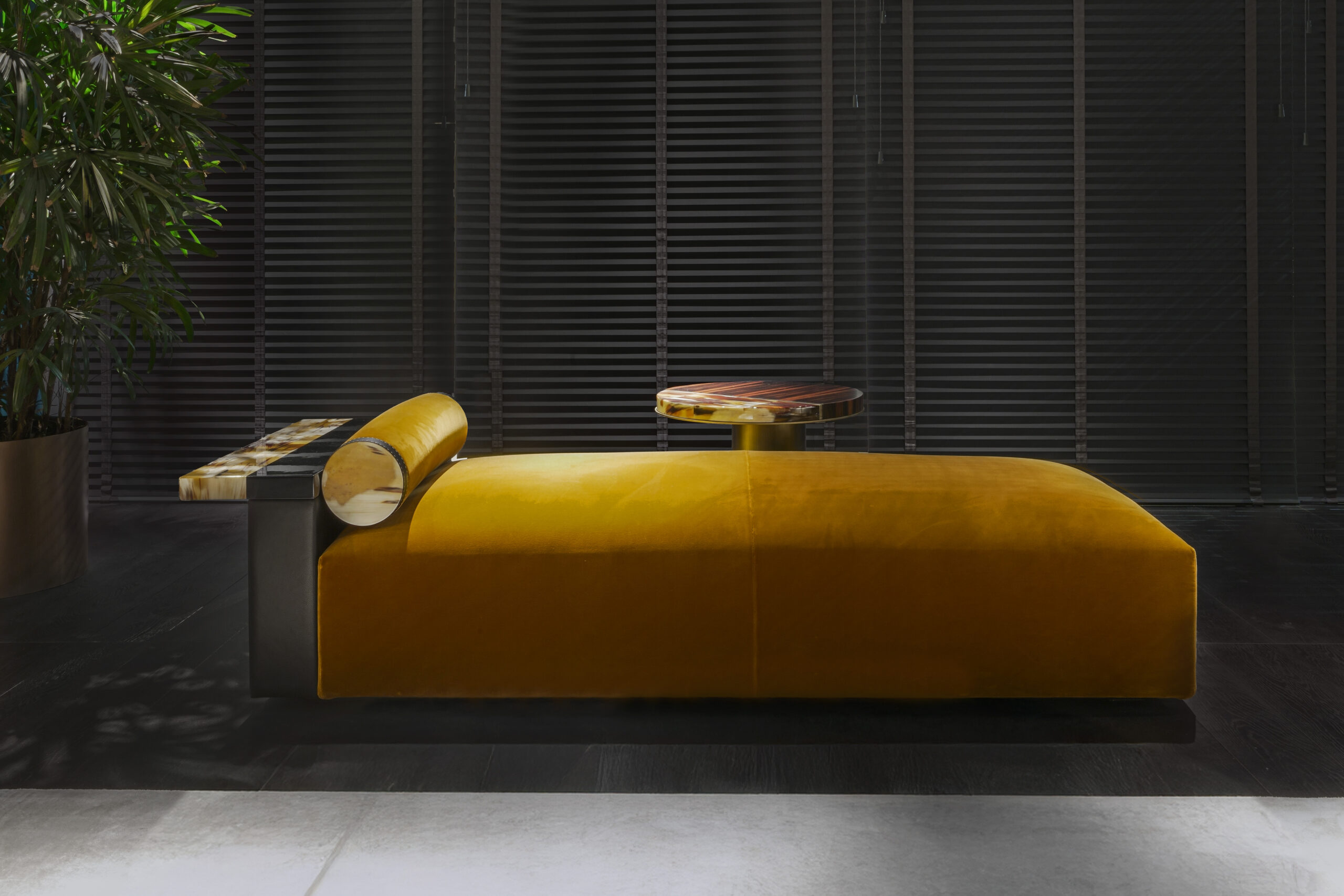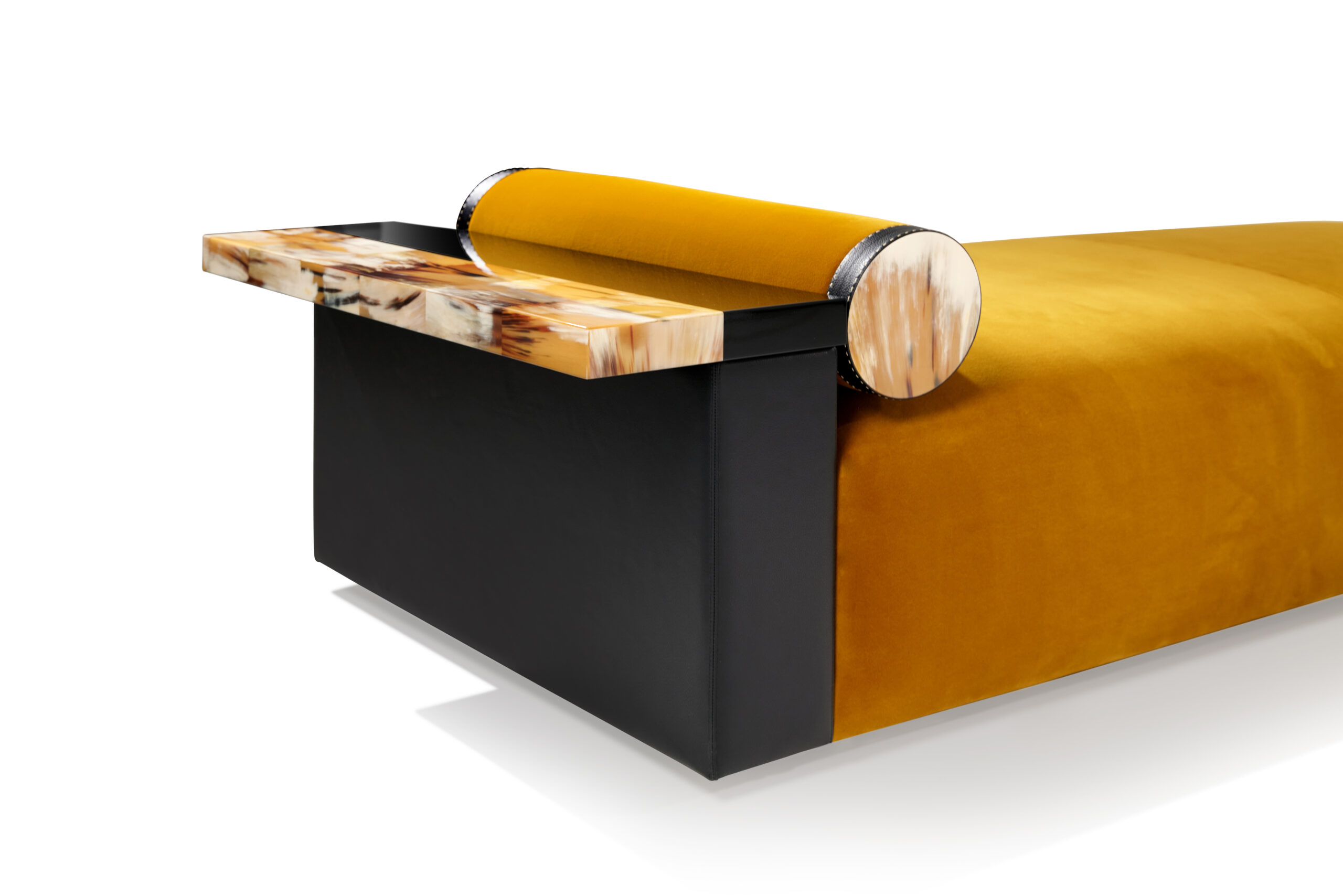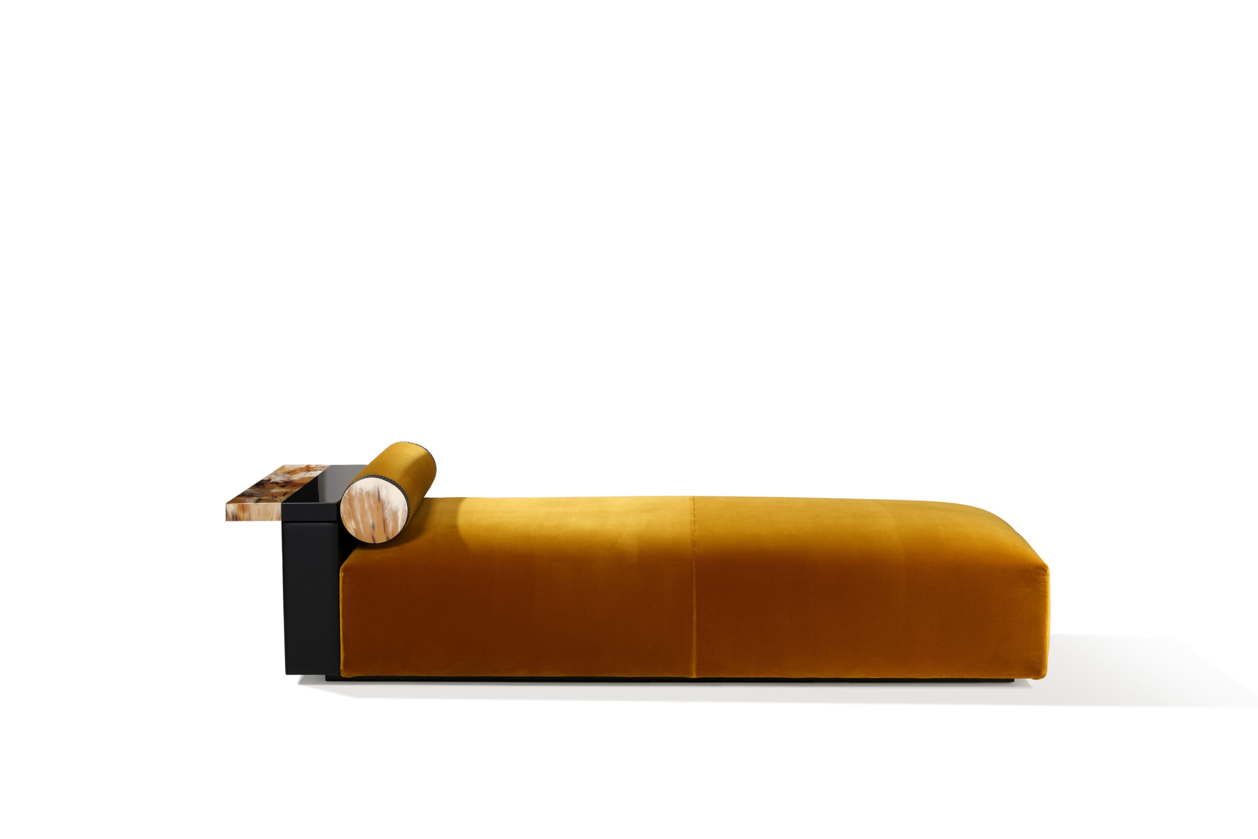 The Egon chaise longue is an invitation to relax, designed to offer comfort and elegance. The seat cushion is upholstered in Monsieur Baudelaire fabric, a luxurious cotton velvet proposed in a warm mustard 001 color (cat. A), which beautifully contrasts with the pebbled leather in Onyx color that covers the armrest. Every detail of the chaise longue is thoughtfully designed to combine functionality with style. A practical tray made of black lacquered wood and natural horn rests on the armrest, adding a refined touch. Horn’s distinctive grain adds an elegant touch and celebrates the artisanal craftsmanship that makes each piece unique.