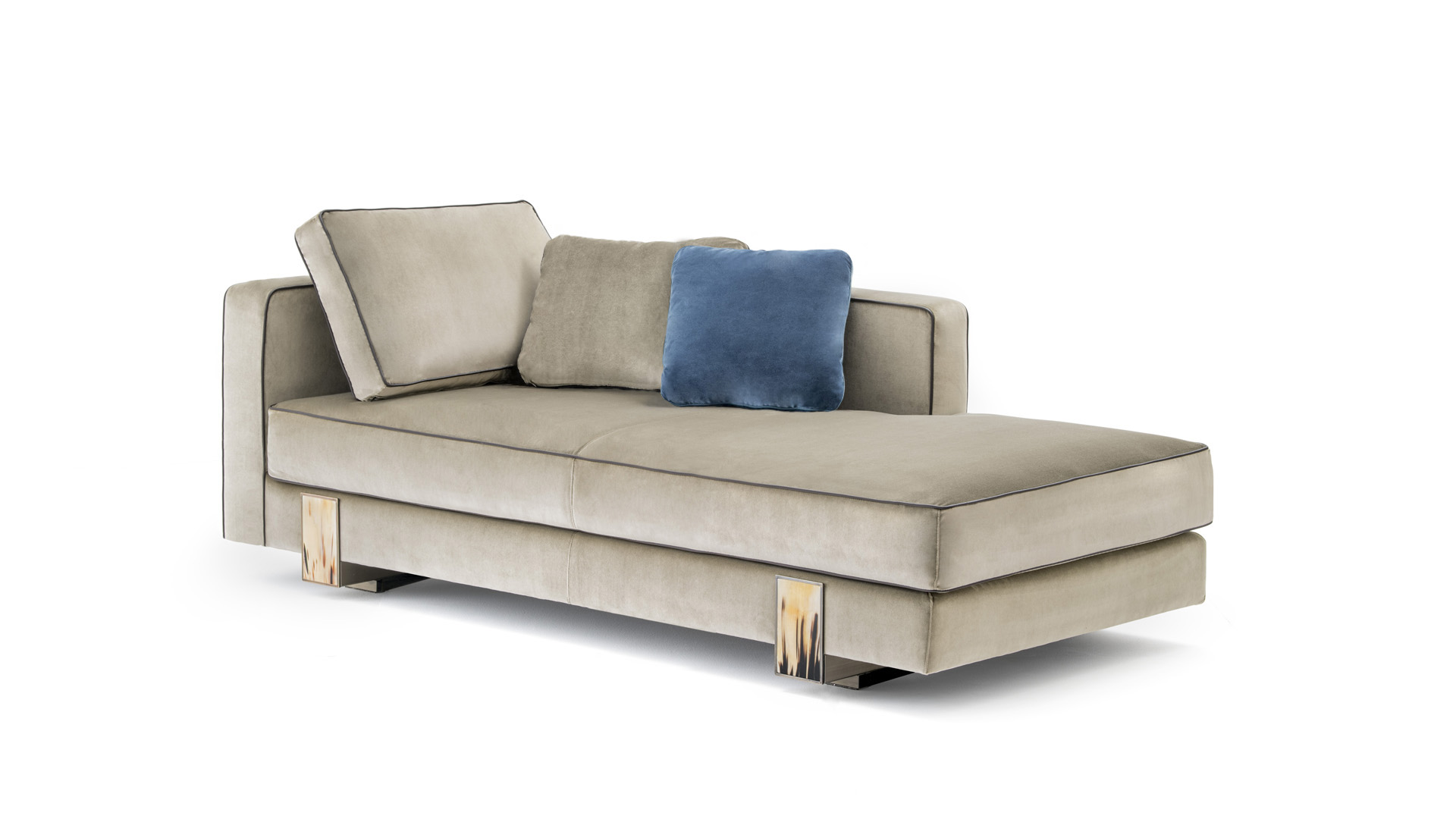 Featuring impeccable style and sublime comfort, the Adriano chaise longue will offer an instant air of elegance to any interior. Individually artisan made, the chaise longue is proposed in Lario velvet (cat. D), in a neutral color n. 23, but an array of sumptuous upholsteries is also available. Embellished by four feet in matte horn and burnished brass, this chaise longue is added a unique value and aesthetic going beyond time and fashion. The padding in multi density expanded polyurethane foam, goose down and memory foam offers an ultra-comfortable lounge experience.