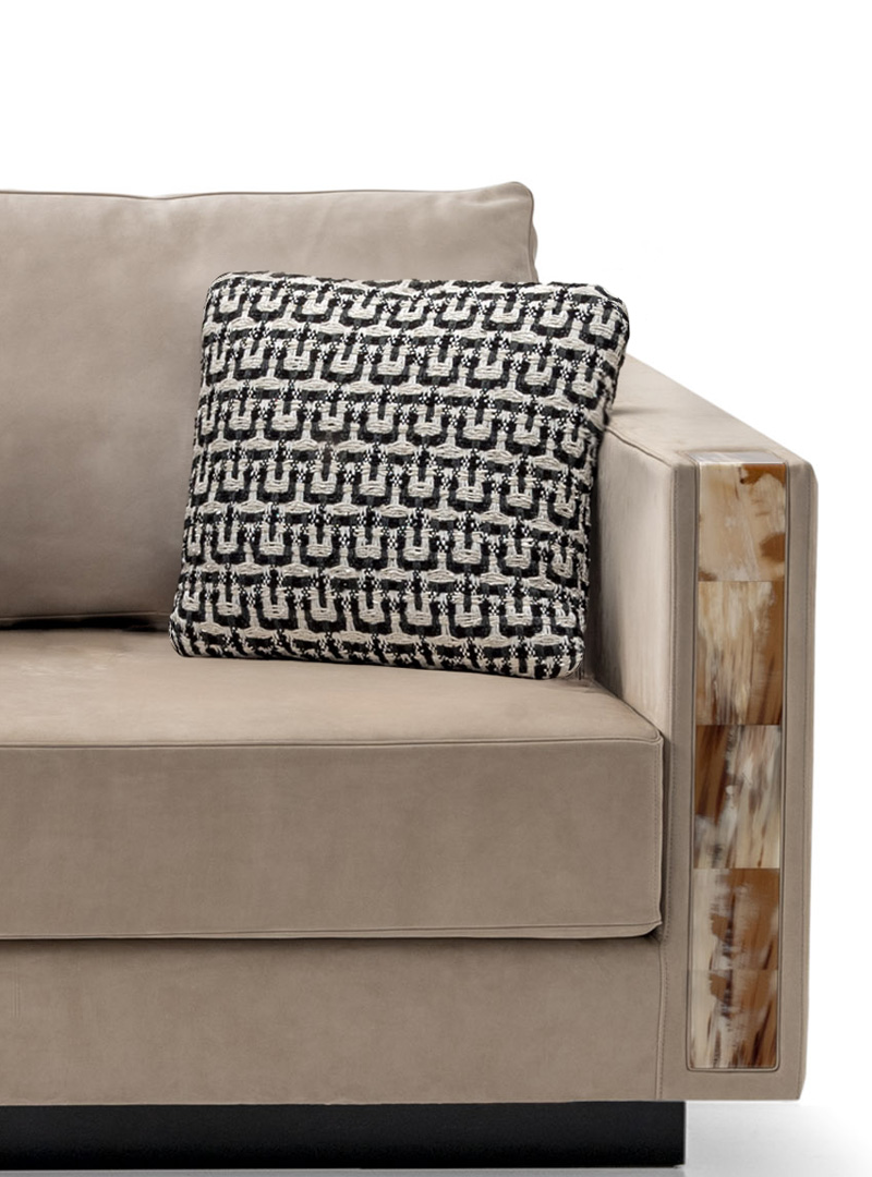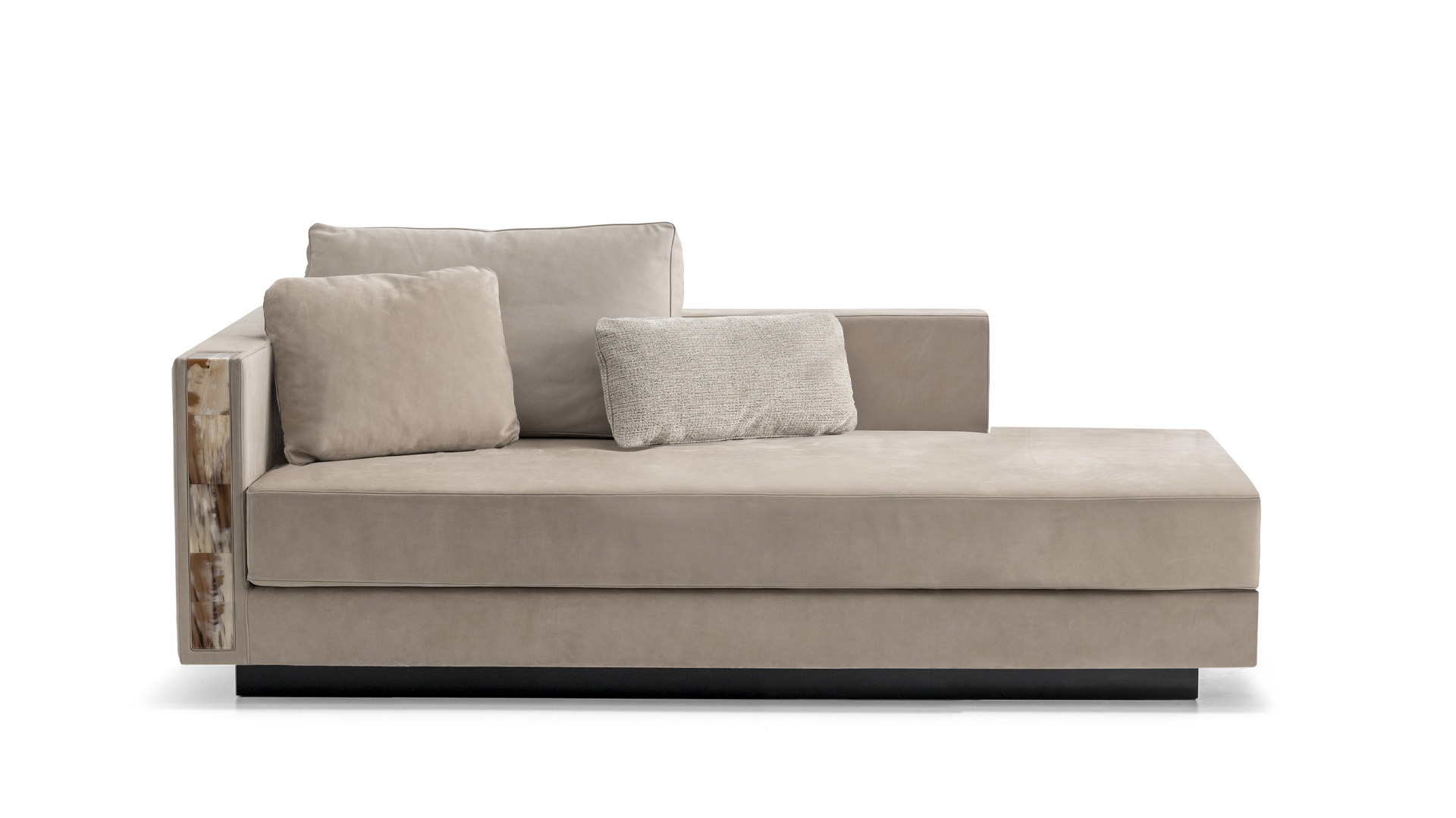 Pairing optimum sitting comfort with high-style, the Zeus chaise longue is perfect for bedrooms, studios or lounges. The design is proposed in a soft Carmen nabuk leather (cat. Luxe) in Sabbia colour, a nuance that recalls the beach sand and ensures a warm, natural feeling. Also available in customizable upholstery, the chaise longue is distinguished by handcrafted L-shaped armrests in glossy light horn. The padding in multi-density expanded polyurethane foam, goose down and memory foam offers a refined relaxation. Resting on a sturdy base in wood with lacquered black gloss finish, the Zeus chaise longue is available both in right-hand or left-hand orientation and can be suited to any space and design need.