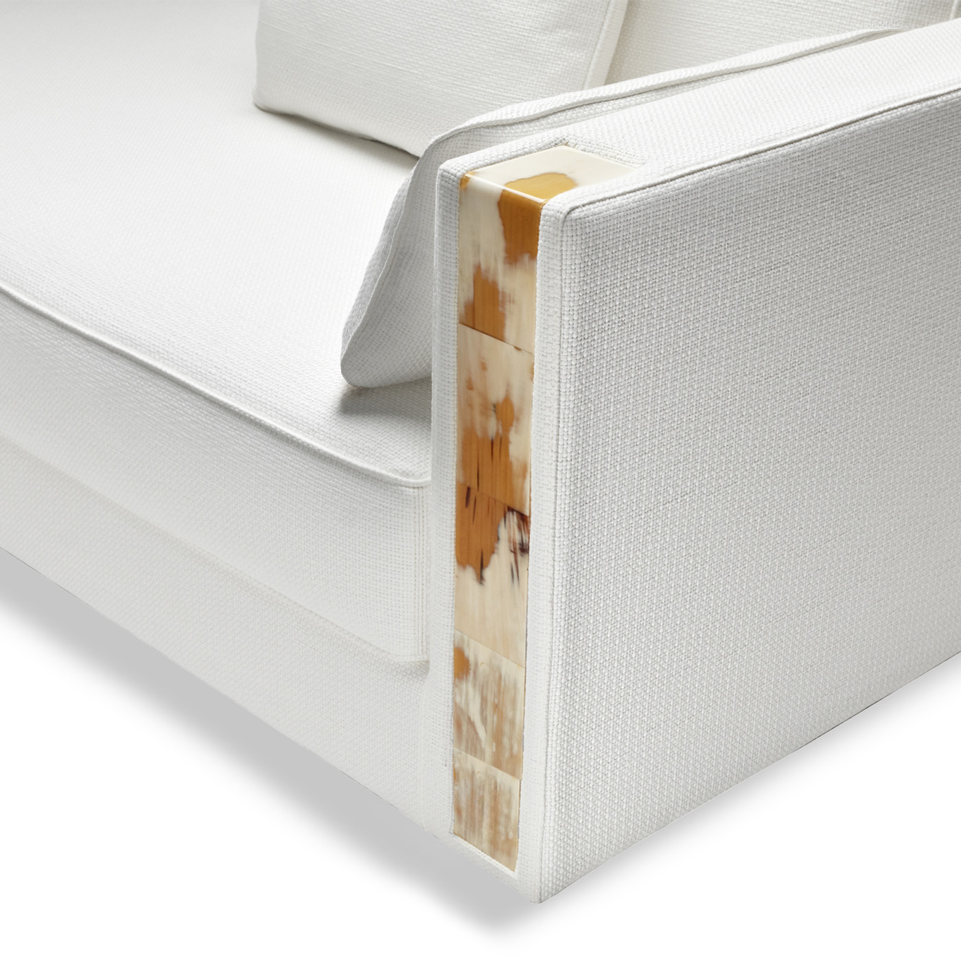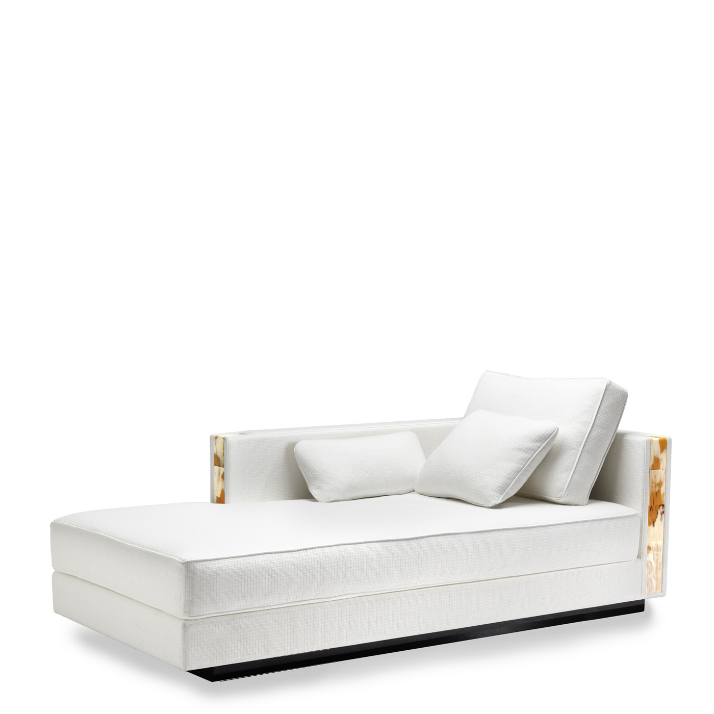 Pairing optimum sitting comfort with high-style, the Zeus chaise longue is perfect for bedrooms, studios or lounges. The design is proposed in a textured Grand Natté fabric (cat. A) in White colour. The chaise longue is distinguished by handcrafted L-shaped armrests in glossy light horn and its upholstery is customizable.