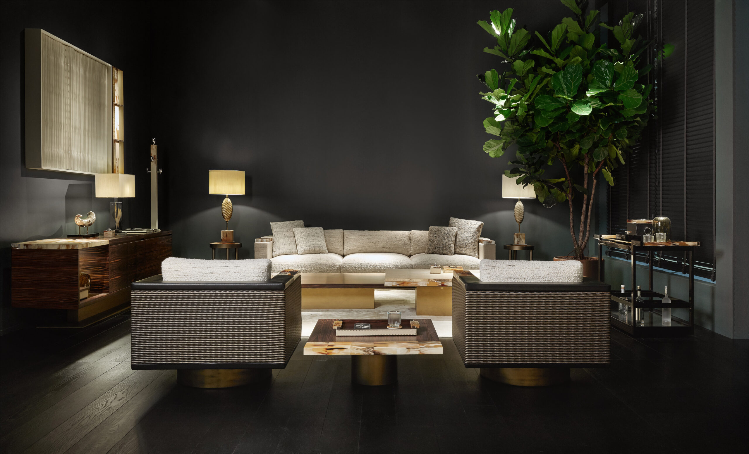 A refined synthesis of artisanal savoir-faire, material research, and uncompromising comfort, the Egon armchair is designed to elevate the most exclusive living spaces, where every detail tells a story of excellence, character, and timeless beauty. With generous proportions that naturally embrace the body, Egon offers a welcoming and sophisticated seating experience. The seat is upholstered in Lamberto fabric, color 001 (cat. A+), a jacquard with rich texture and tactile depth. The shell and armrests create a refined visual and material contrast by combining the Aida pebbled leather in Onyx color with the Click All Black fabric (color 002), whose intricate weave offers a three-dimensional appeal and strong personality.