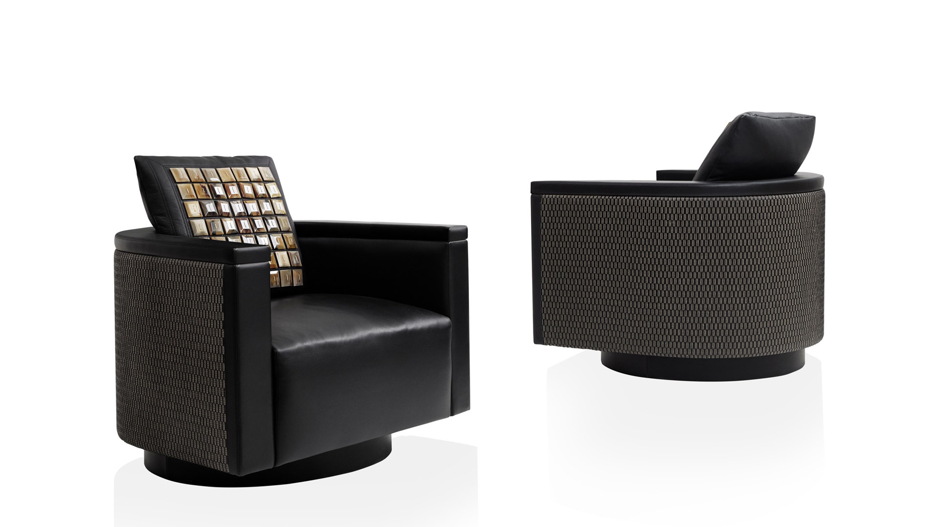 Armchair upholstered in Aida pebbled leather (cat. Super), Onyx colour. Structure upholstered in Kotakot fabric, black colour. Cushion in pebbled leather, Onyx colour with horn gems. Base in Aida pebbled leather (cat. Super), Onyx colour. Multi-density expanded polyurethane foam and goose down padding. Decorative cushion padded with goose down.