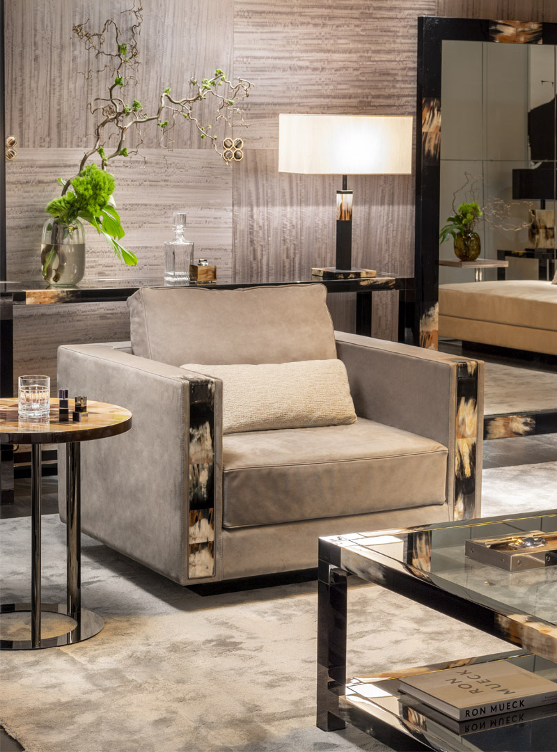 Exquisite and imposing, the Zeus armchair stands out for its contemporary style, generous proportions and great comfort. Standing upon a wooden base with a high-polished black finish, the design is proposed in premium grey Carmen nabuk leather (cat. Luxe), but different upholstery or COM options are available. The padding in multi-density expanded polyurethane foam, goose down and memory foam offers a refined relaxation. With highly distinctive dark horn inlays emphasizing its armrests, Zeus is a seating solution outside traditional canons which will bring great personality to any interior.