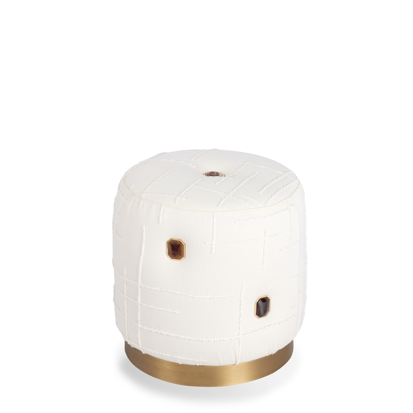 Pouf upholstered in Magnolia fabric colour 1 with 7 gems in horn and 24k gold plated brass. Base in wood with satin brass effect.