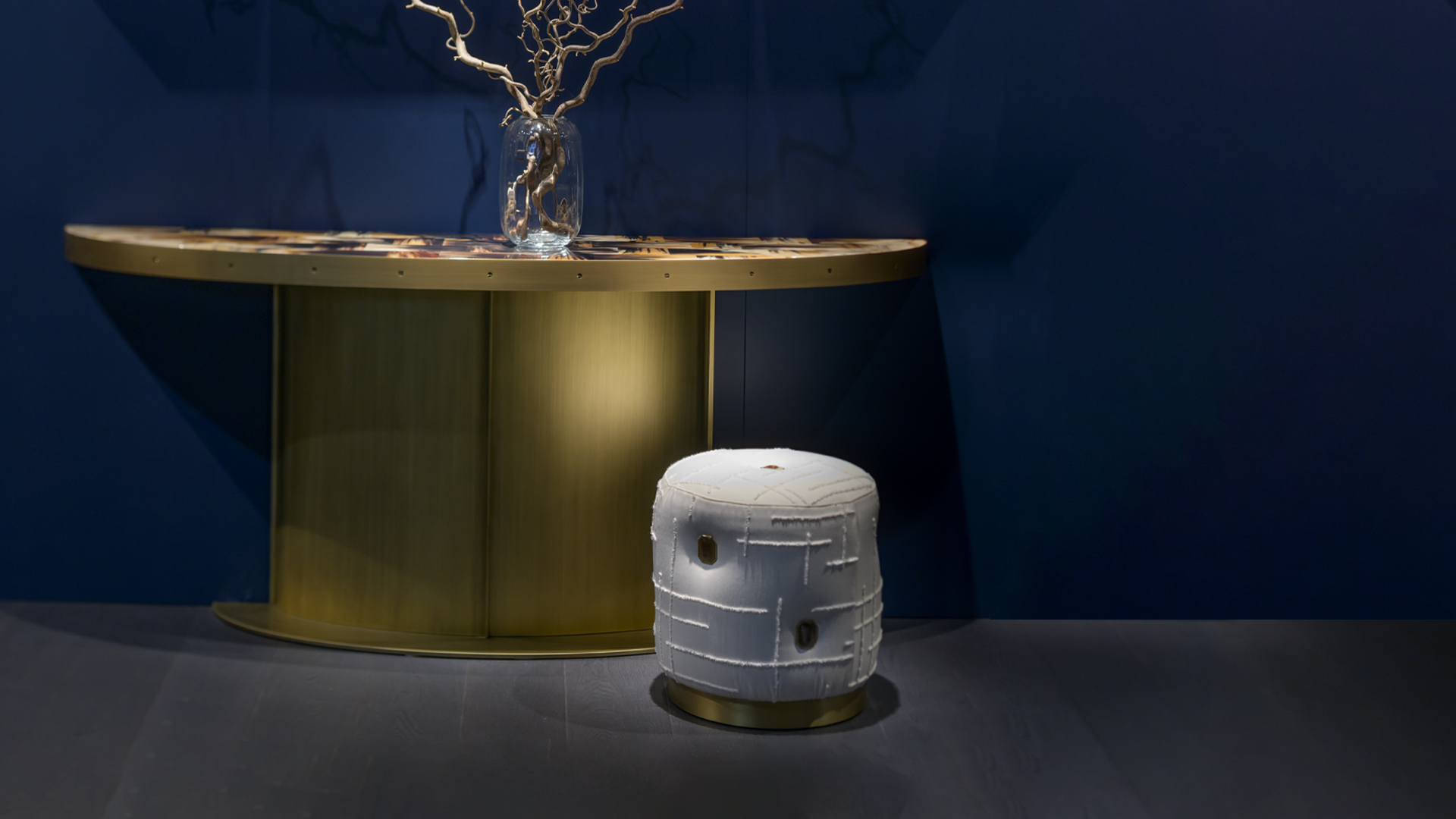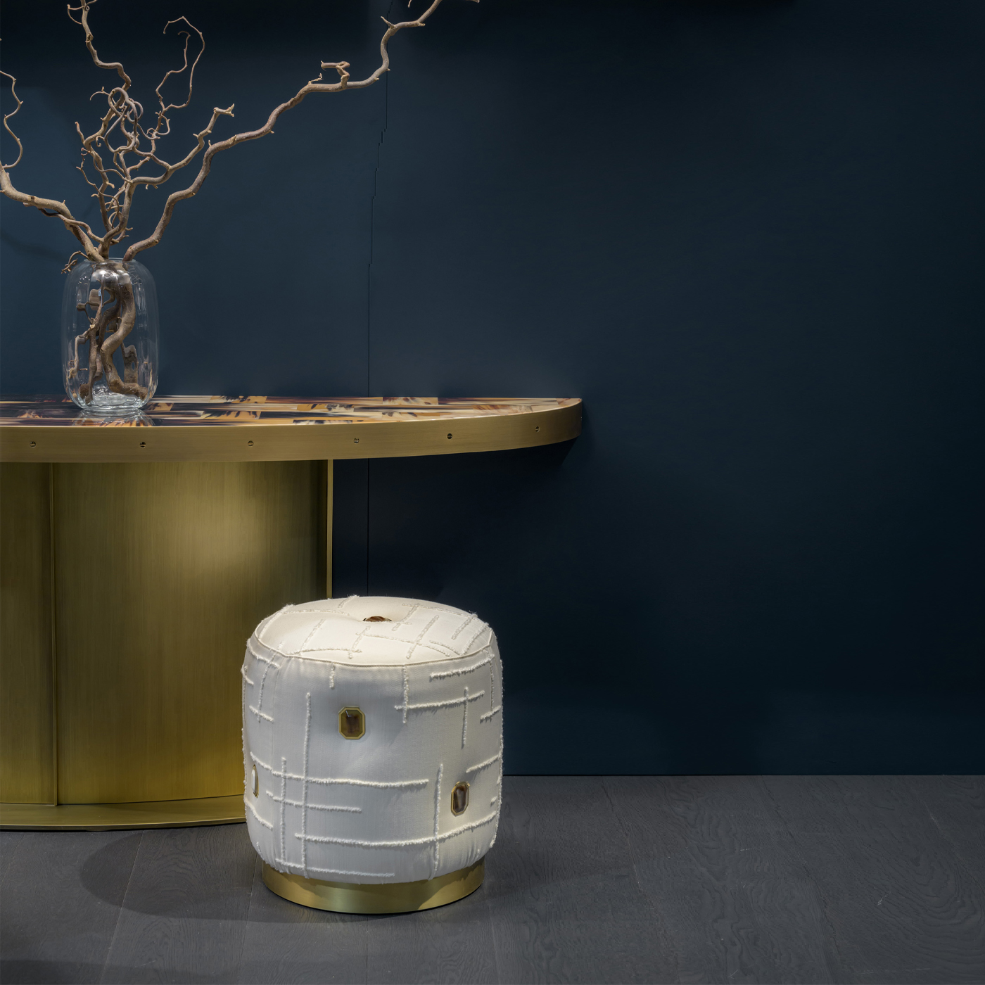 The design is elevated by elegant octagonal inserts in natural horn and 24k gold plated brass that are nestled like precious gems to enhance the sartorial craftsmanship of this pouf. Resting on a wooden base with satin brass-effect, Olivia is a versatile element that can be used as a complement to sofas and armchairs or to complete the bedroom furniture.