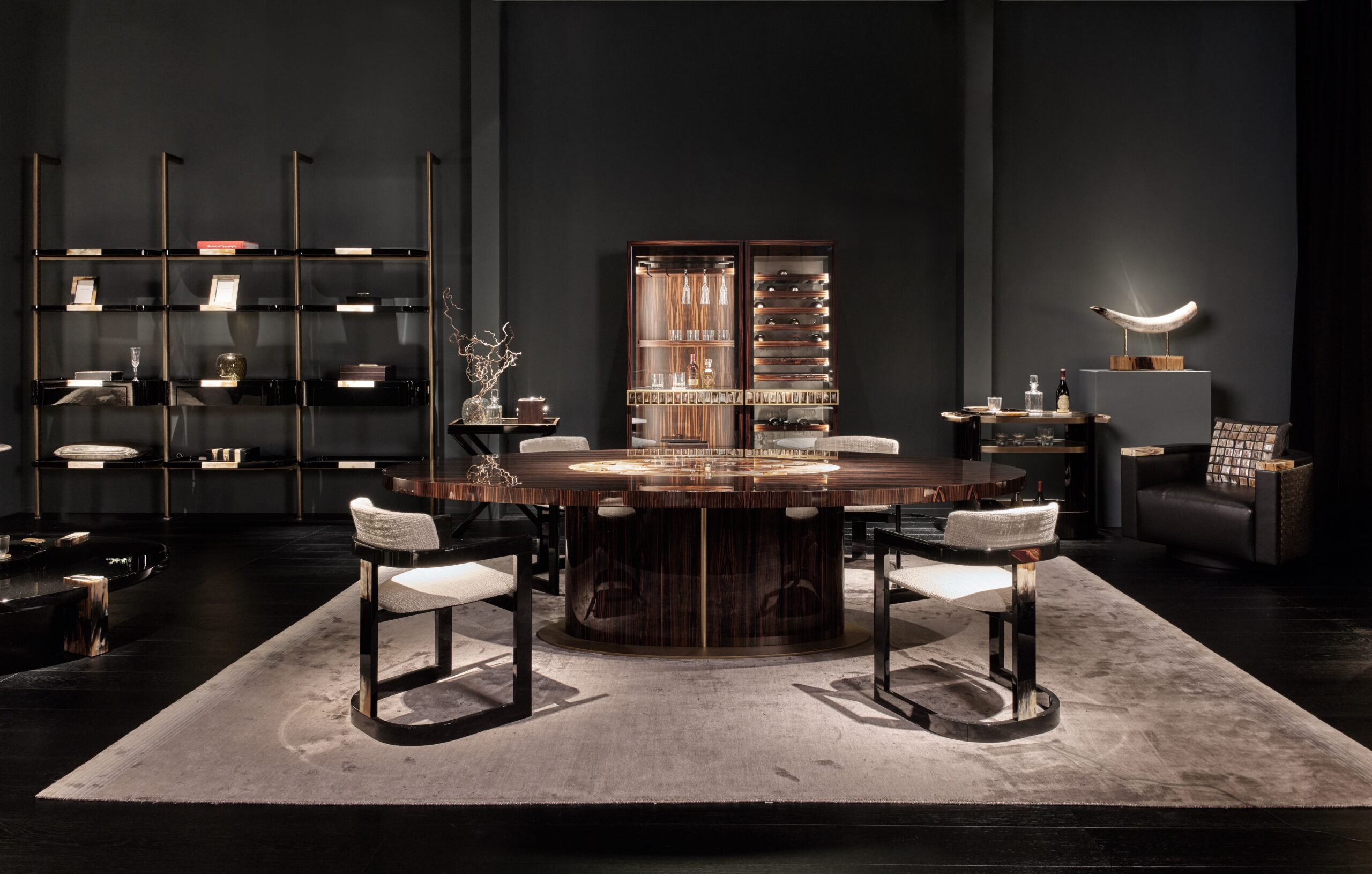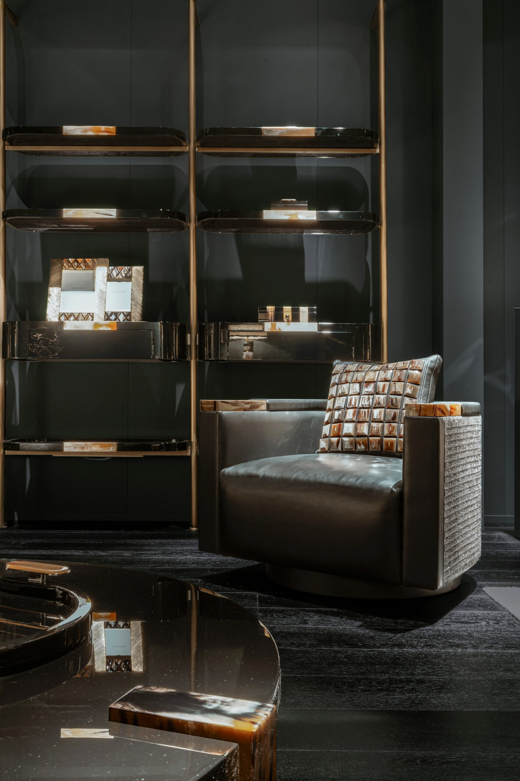 The signature element of Neria shelving is the use of natural horn inlays, expertly applied to each shelf. The horn’s organic variations in color and texture bring a vibrant material contrast, elegantly complementing the deep sheen of the wood and the sober finish of the metal. Conceived to display books, art pieces, and curated accessories, Neria is a display system that embodies a contemporary spirit and enduring elegance.
