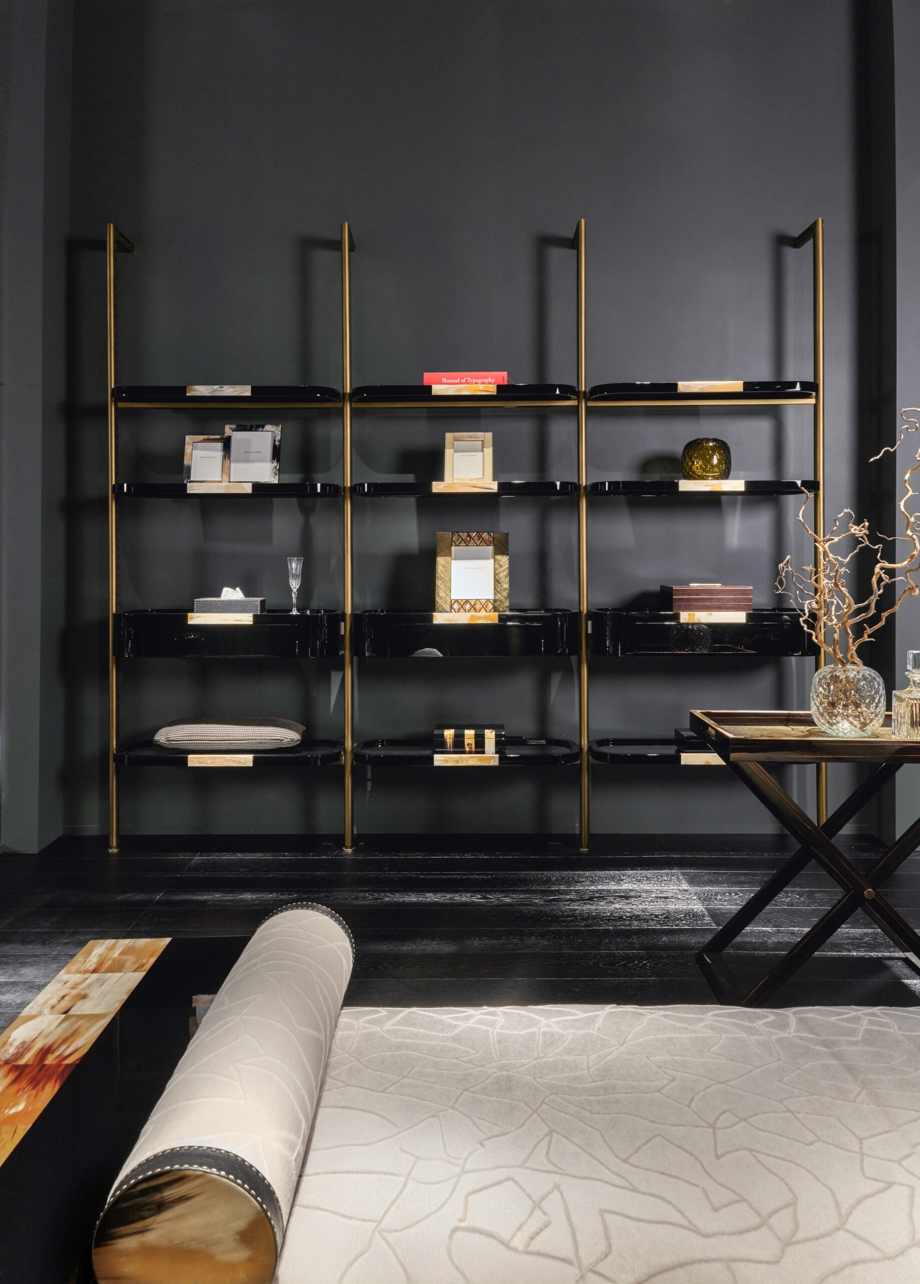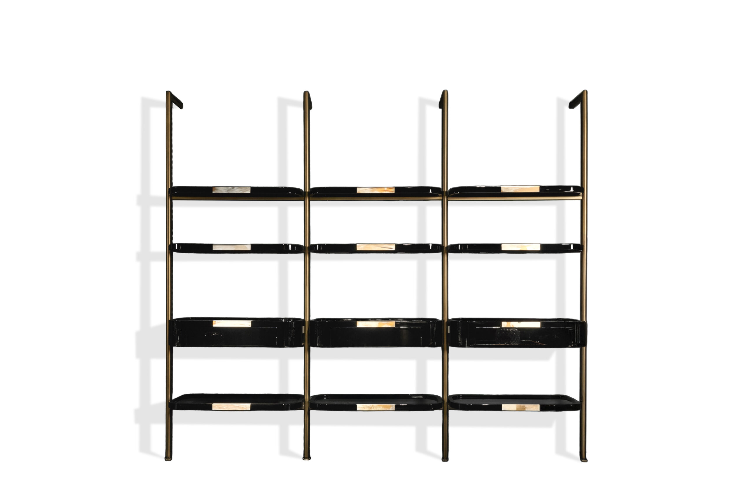Modular shelving in glossy black lacquered wood, horn and burnished metal.