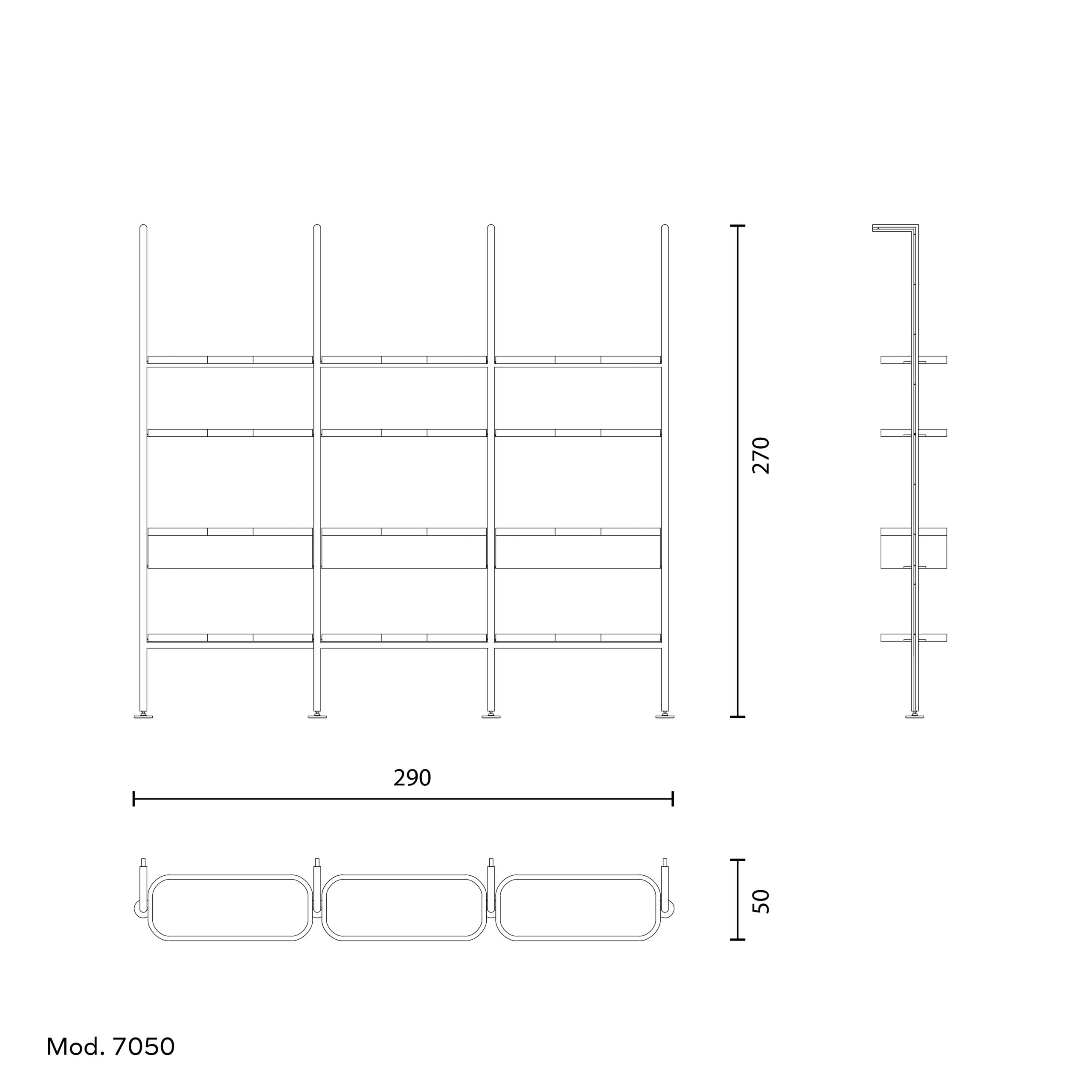 Neria is a modular shelving system that effortlessly blends refined materials with a bold, contemporary aesthetic. Its vertical structure, crafted from burnished metal, is characterized by clean, architectural lines that evoke both strength and discreet sophistication. Slender metal columns divide the composition with a rhythmic cadence, creating a balanced dialogue between full and empty spaces. The shelves, in glossy black lacquered wood, feature gently rounded corners and subtly raised edges that soften the system’s geometric rigor.
