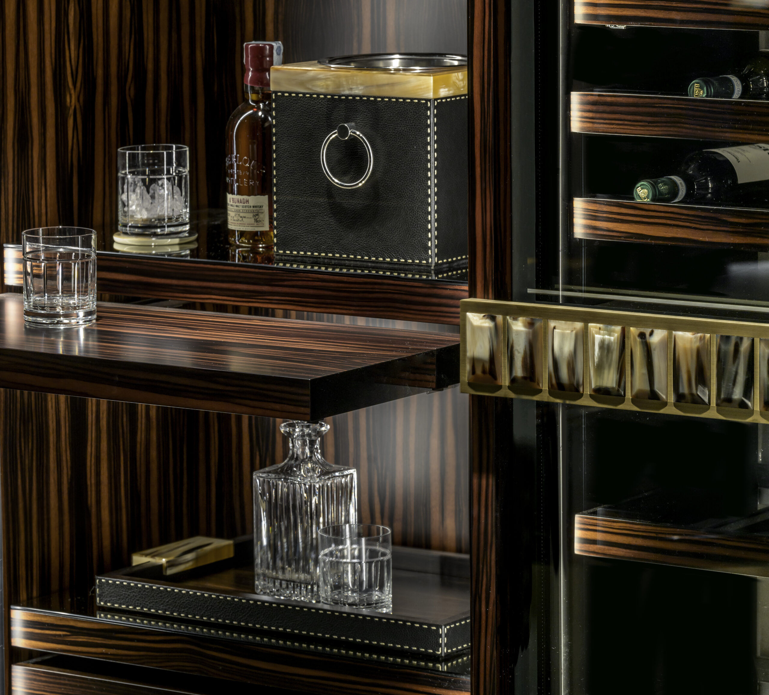 The left side of the cellar is not refrigerated and offers ample storage space for all kind of glasses. It is also equipped with removable tray and drawer to keep all necessary tools for preparing and serving drinks. The cellar includes an elegant ice bucket in horn, stainless steel and Amara ebony veneer, four horn coasters and a practical corkscrew in horn and stainless steel. This cellar can also be fitted with a CE certified blast chiller, available upon request.
