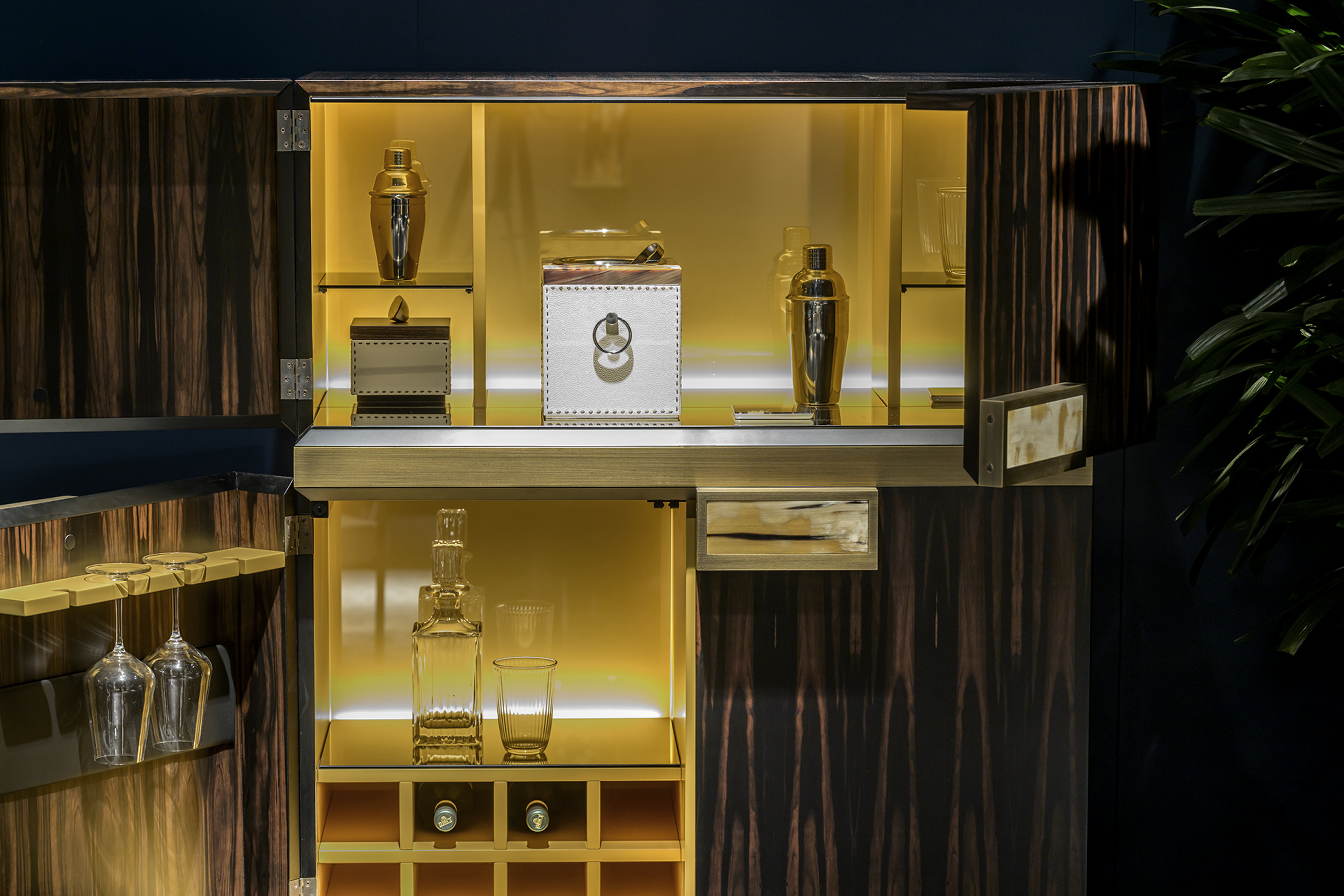 Cosmopolitan is also available in Makassar ebony with matte finish and base in burnished brass with handles in horn and burnished brass. The interior, lit by a LED lighting, is proposed in an elegant Tangerine color lacquer with matte finish that gives a contemporary touch to this design.