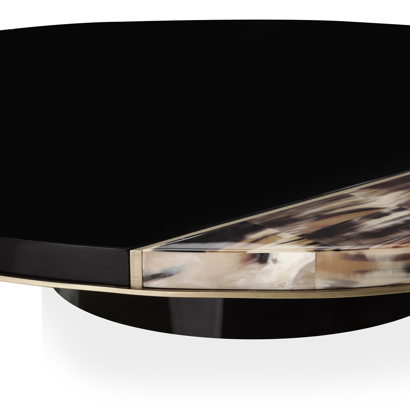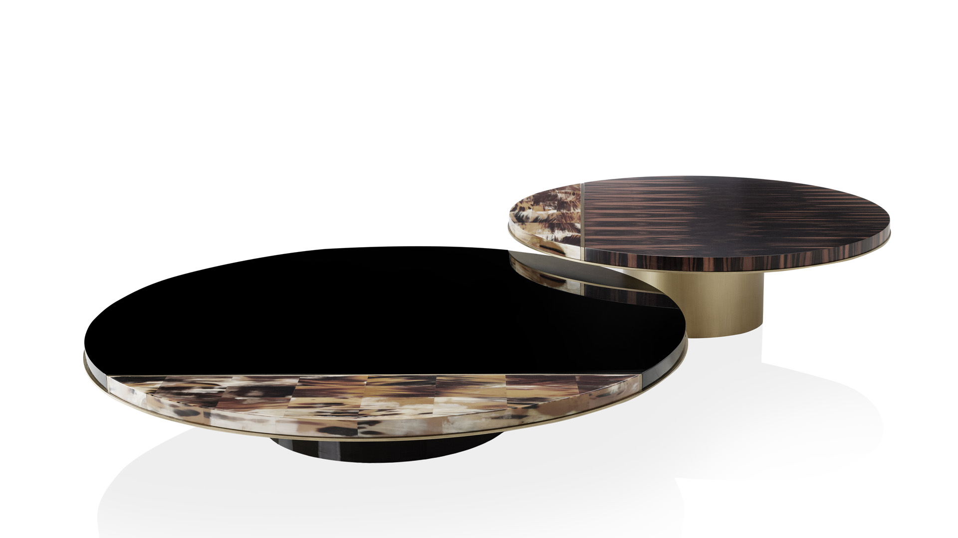 The circular shapes of the tops are cut by a half-moon insert in horn to create new geometries. The blending of evocative materials and the unrepeatable horn nuances lend a unique visual effect. All tables feature a monolithic base available in burnished brass or lacquered metal.