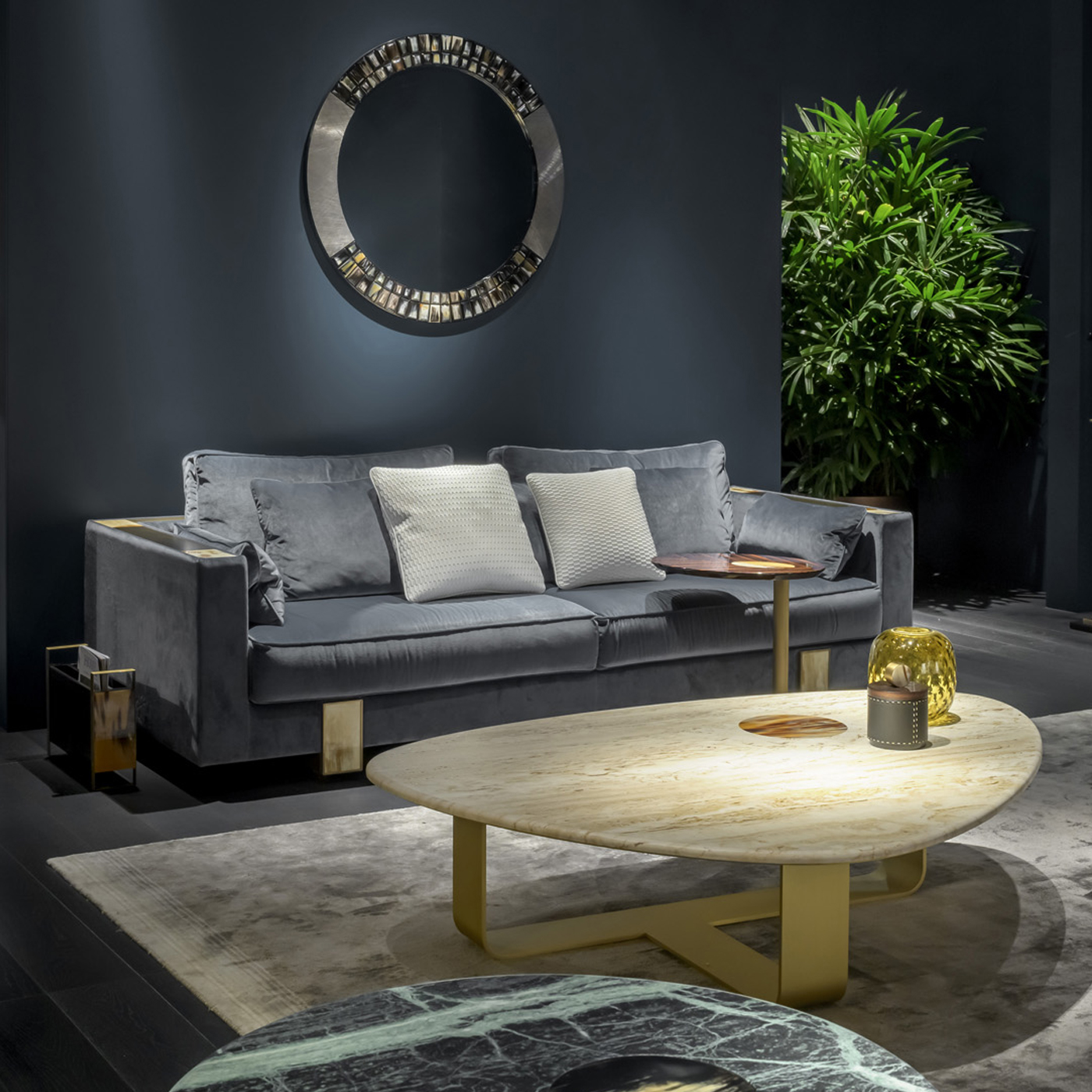 The coffee table is also available with the tabletop in Travertine and horn. Refined materials that are skillfully worked by expert craftsmen to turn Demetra into an exclusive furnishing piece for the most sophisticated environments. The neutral and delicate nuances of Travertine are combined with horn, whose elegant veins range from honey to dark brown color tones and create a suggestive effect that invites you to touch the surfaces and appreciate their natural textures. The tabletop rests on an elegant metal structure with satin finish. With its sinuous shapes and prized materials, Demetra is destined to conquer a leading role in the living area.