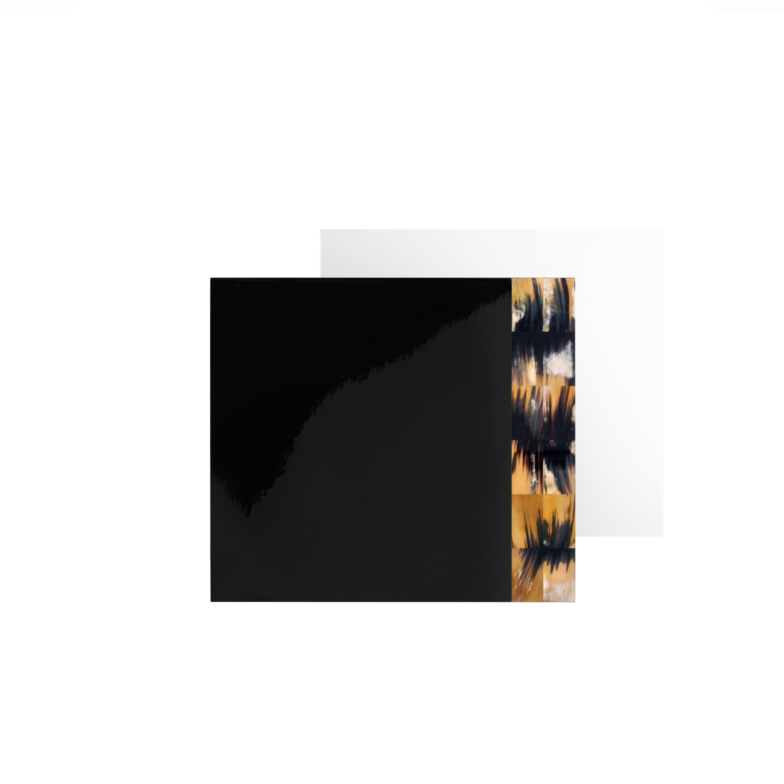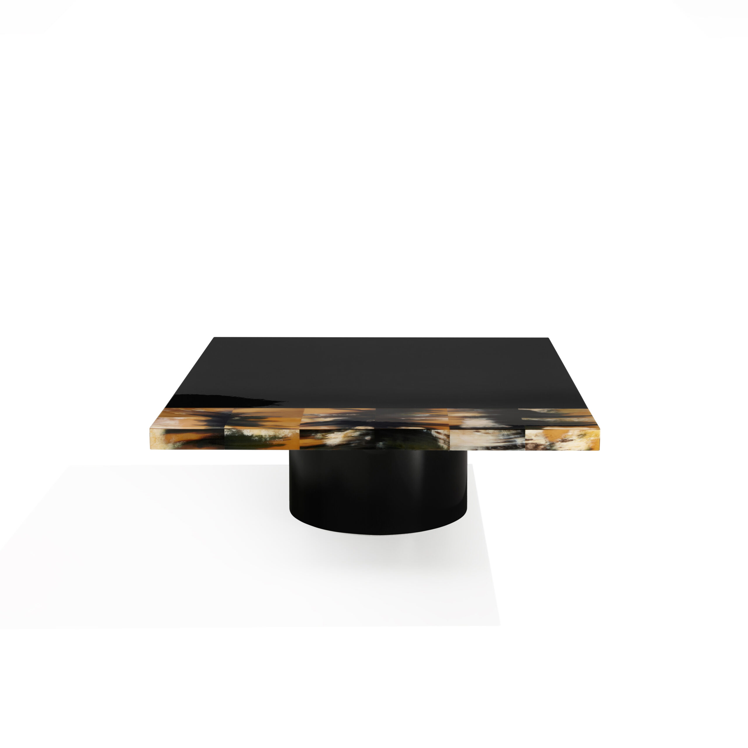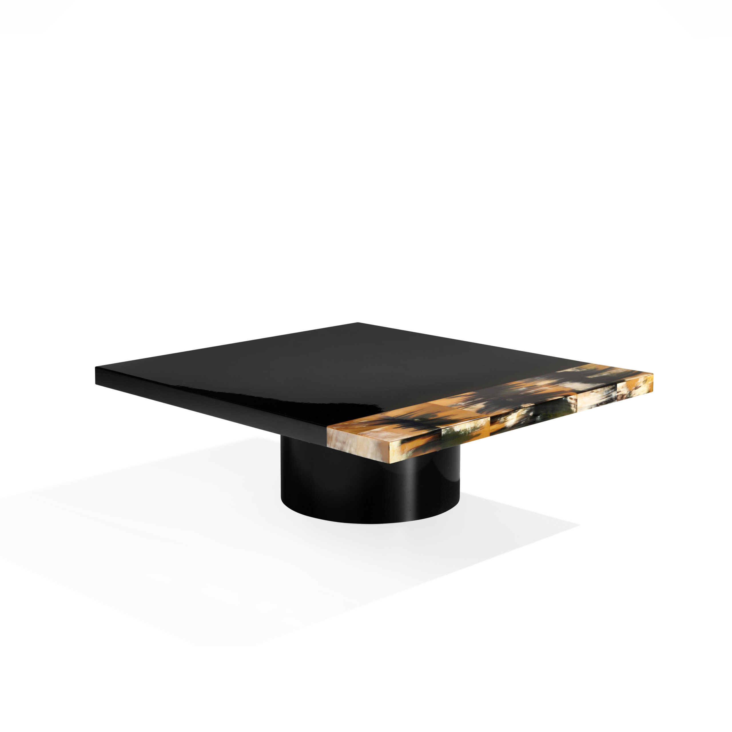Made from glossy black lacquered wood, its clean and contemporary design is enhanced by an elegant horn inlay. Each insert, carefully selected and crafted with great skill, adds a touch of warmth and uniqueness, making each table unique.