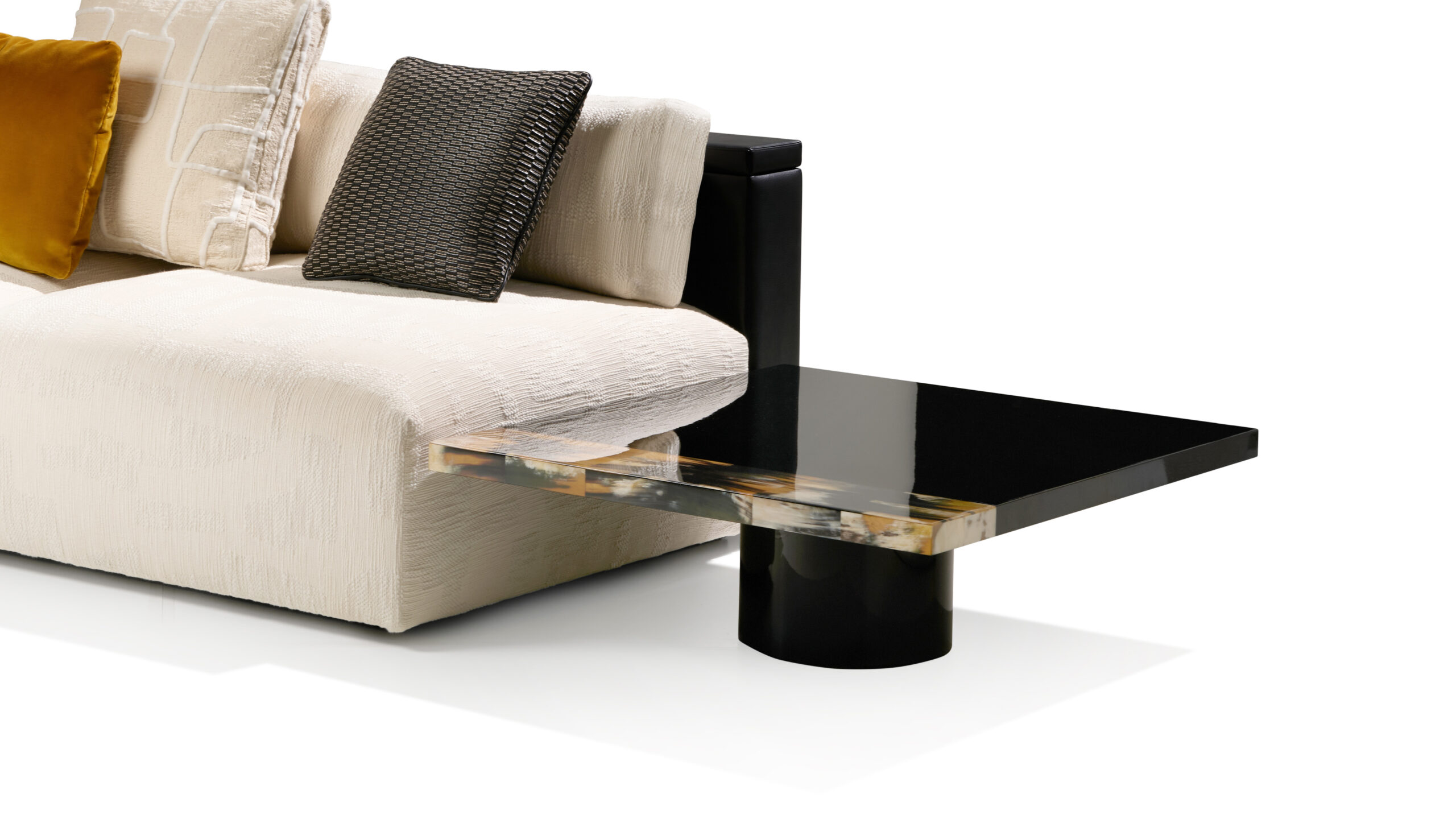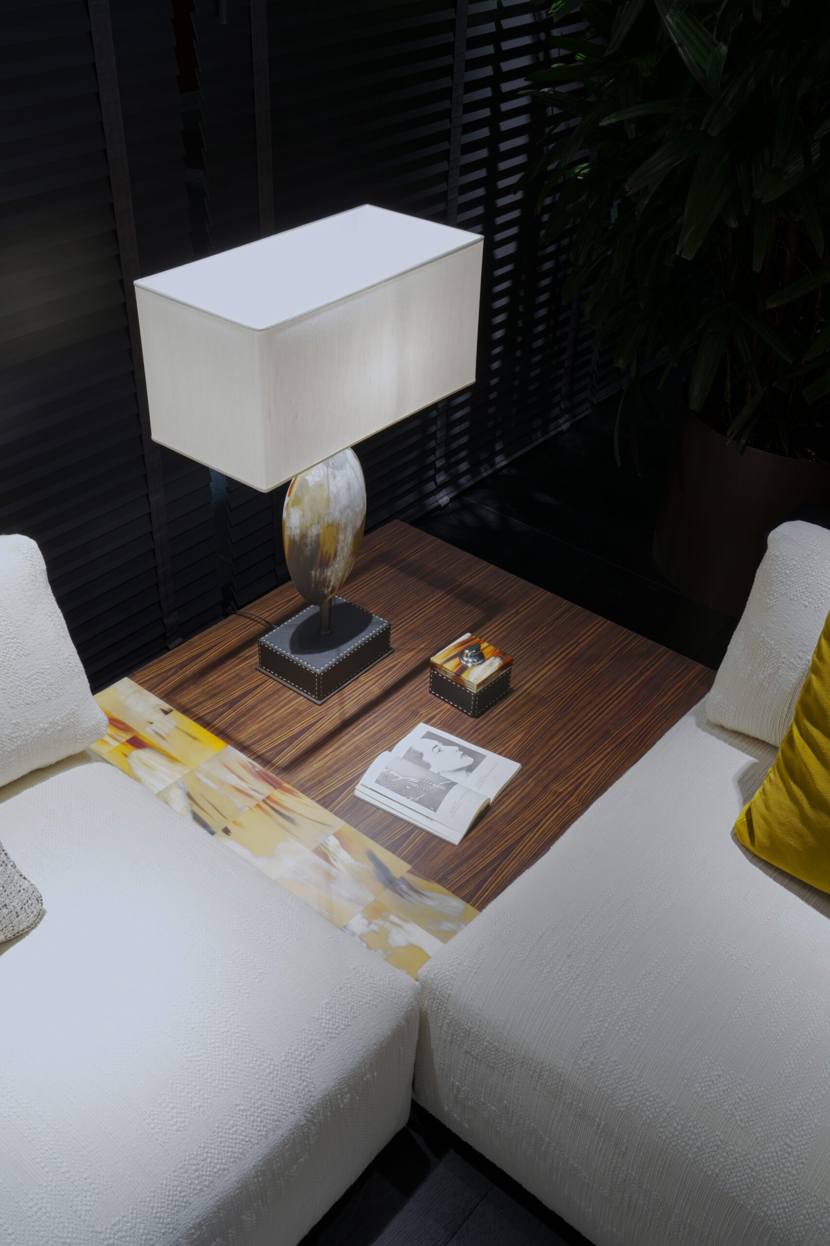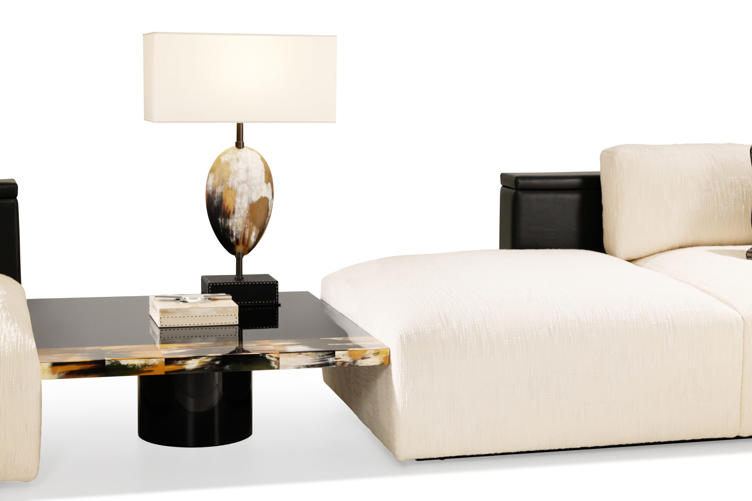 Made from glossy black lacquered wood, its clean and contemporary design is enhanced by an elegant horn inlay. Each insert, carefully selected and crafted with great skill, adds a touch of warmth and uniqueness, making each table unique.