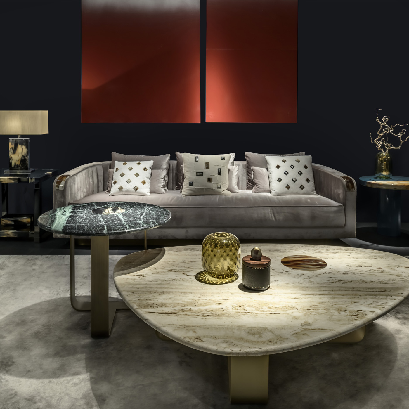 The Apollo side table is also available in satin Dalmata marble. The table top is adorned by a round inlay in glossy horn, rich in textural interest. An asymmetric structure in satin or burnished metal elegantly supports the top while conferring a harmonious balance to the piece. Born from the striking juxtapositions of natural materials and unique colour combinations, the Apollo side table will play a starring role in your living room.