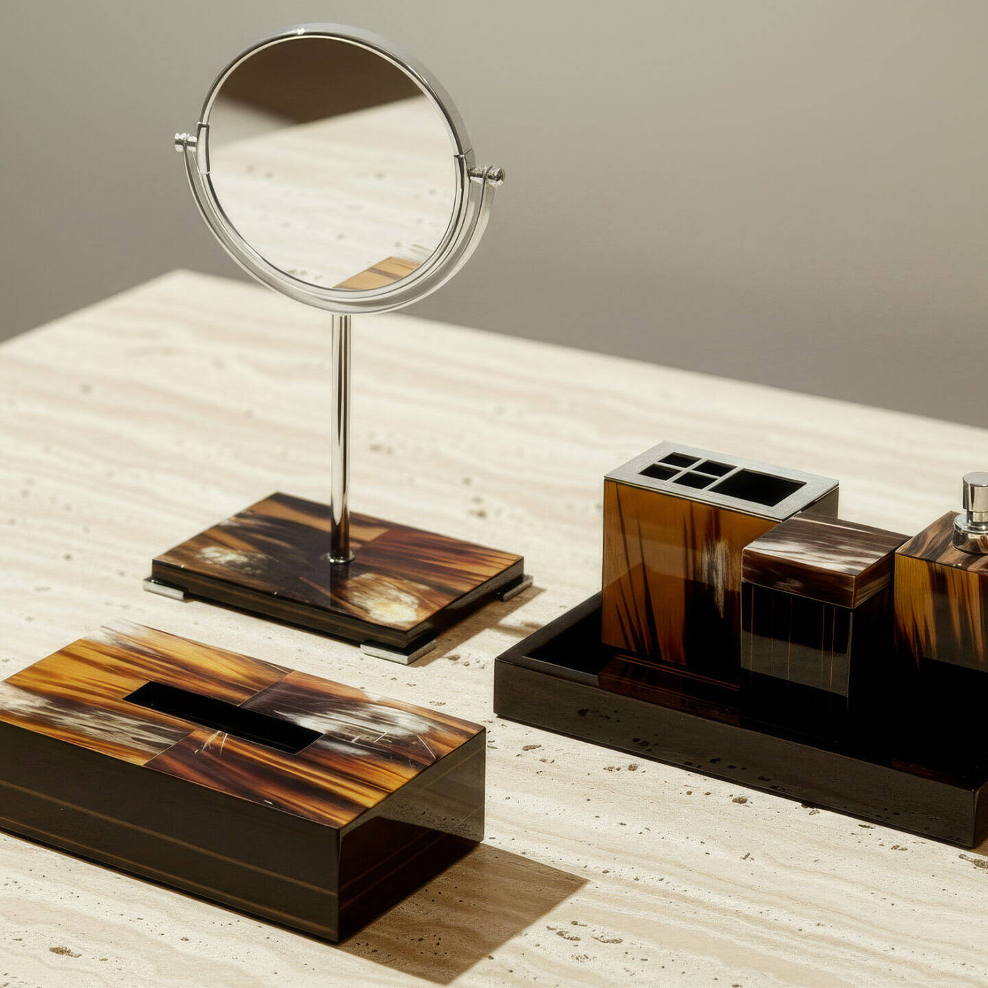 Bath accessories - Berenice bath set in horn and Onyx colour leather - ambiance cover - Arcahorn