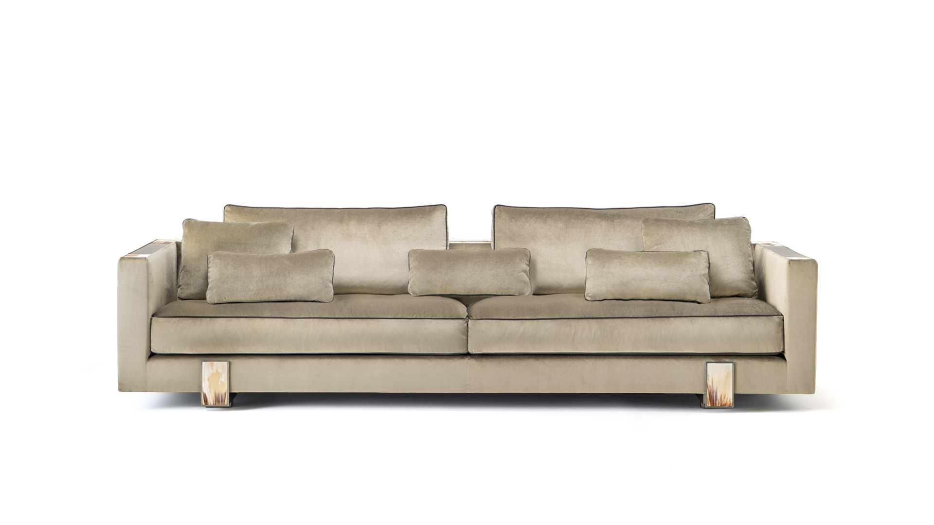 4-seat sofa upholstered in Lario velvet (cat. D), colour n. 23 with edging in the same material and colour. Matte horn and burnished metal detailing. Multi-density expanded polyurethane foam, goose down and memory foam padding.