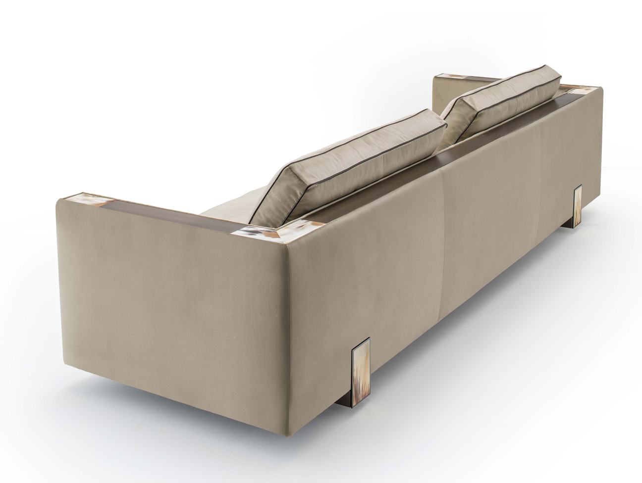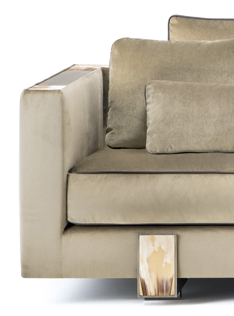 Standing out for its balanced shapes and bold personality, the Adriano 4-seat sofa will create a stylistic point of interest to any domestic scenery. The upholstery in Lario velvet n. 23 (cat. D) converses with unique details in burnished brass and matte brown-veined horn, gracing the upper frame. Additional decorative appeal is lend by four elegant feet in matte horn and burnished brass, conveying lightness to suspended volumes.