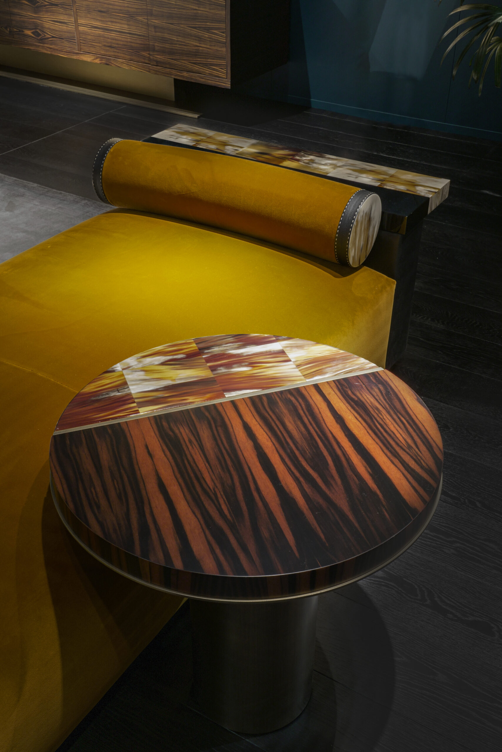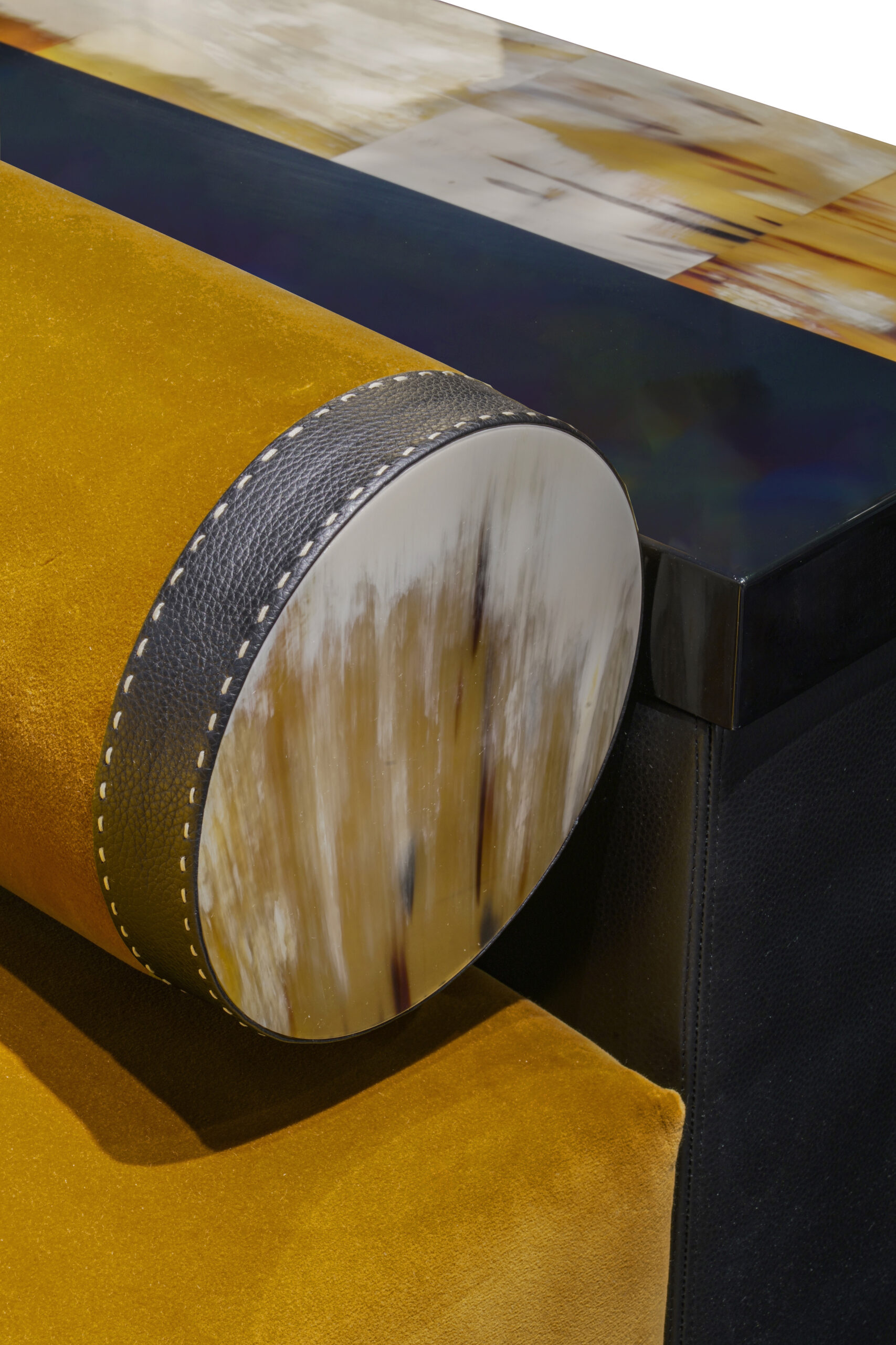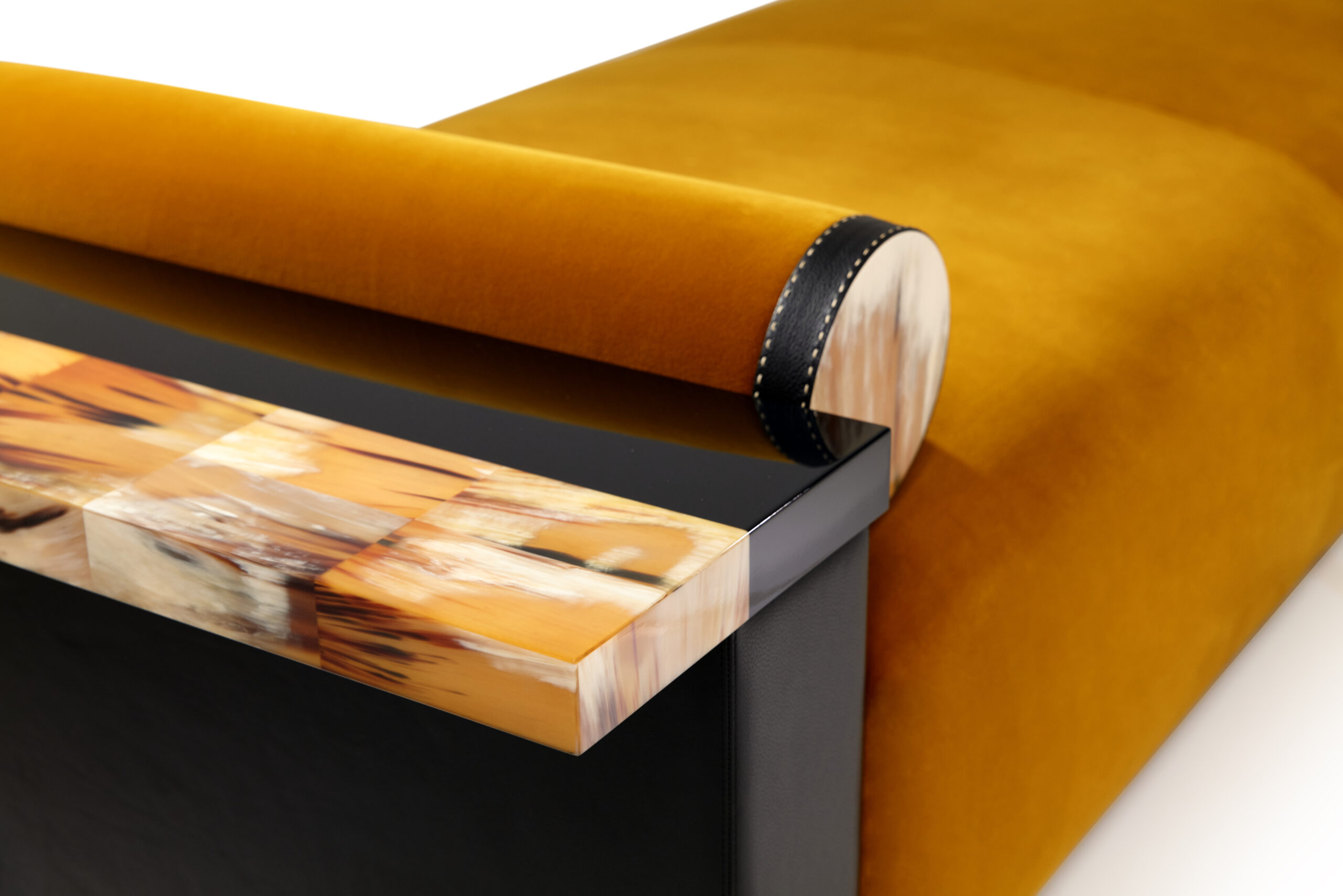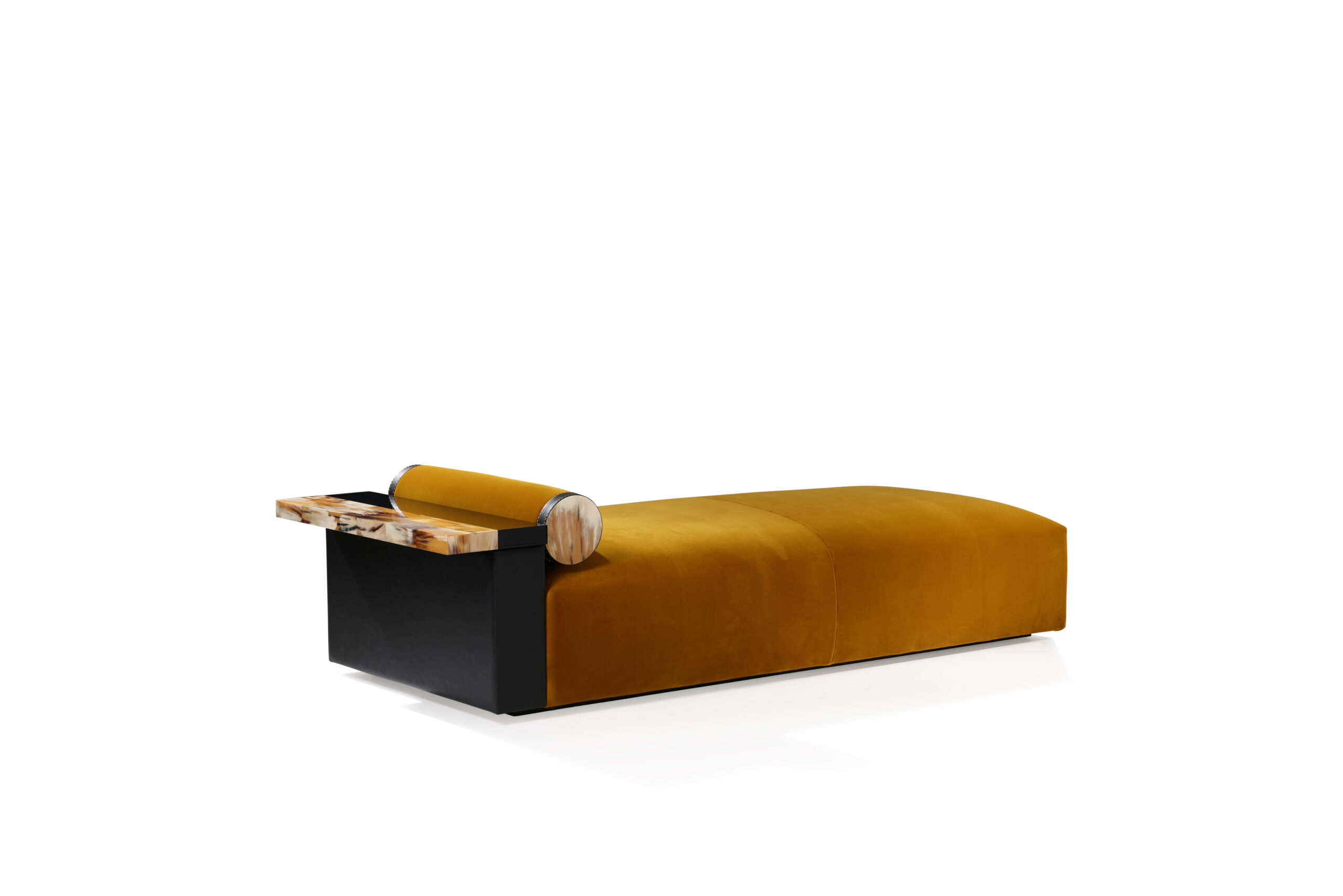 The Egon chaise longue is an invitation to relax, designed to offer comfort and elegance. The seat cushion is upholstered in Monsieur Baudelaire fabric, a luxurious cotton velvet proposed in a warm mustard 001 color (cat. A), which beautifully contrasts with the pebbled leather in Onyx color that covers the armrest. Every detail of the chaise longue is thoughtfully designed to combine functionality with style. A practical tray made of black lacquered wood and natural horn rests on the armrest, adding a refined touch. Horn’s distinctive grain adds an elegant touch and celebrates the artisanal craftsmanship that makes each piece unique.