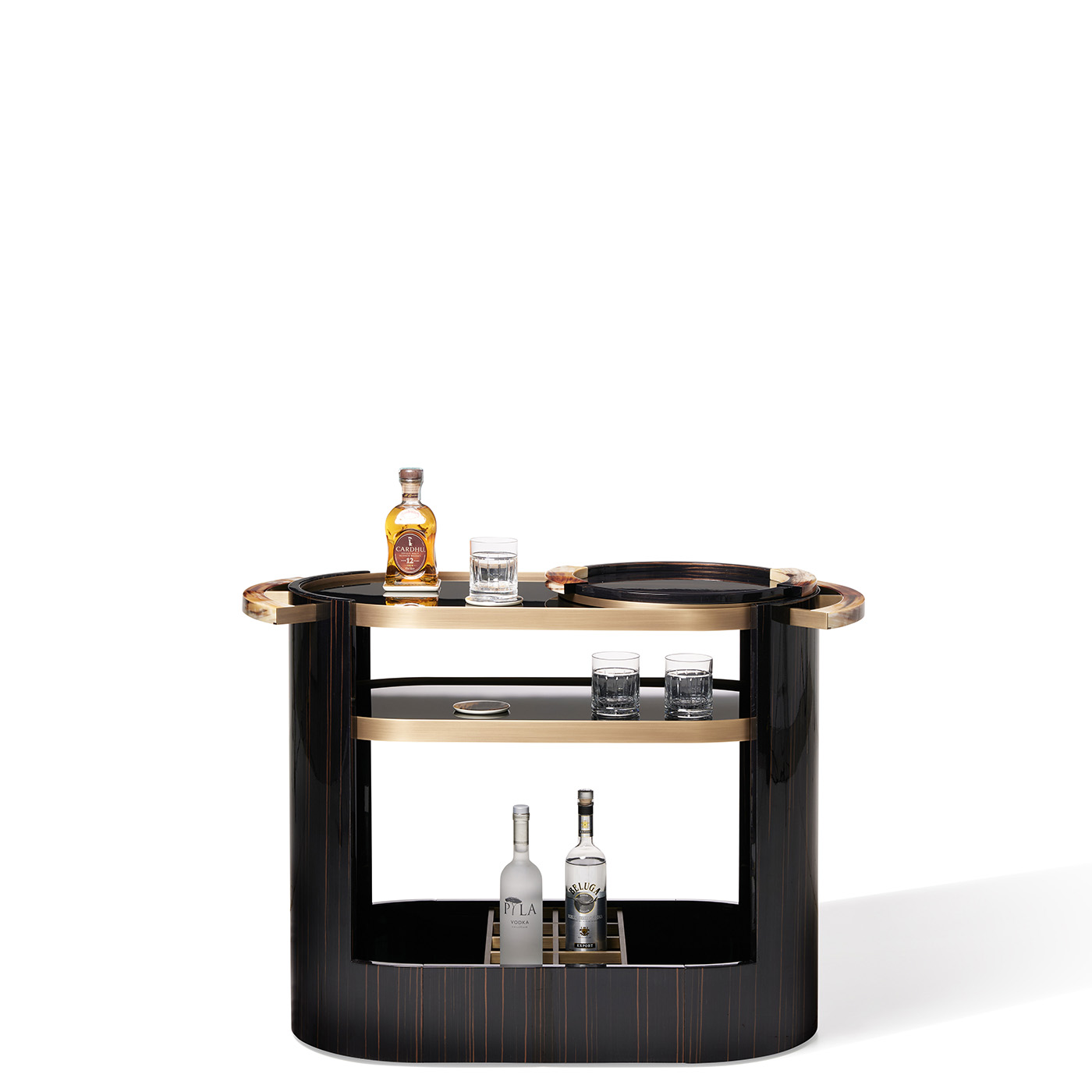 Chaise longue upholstered in Lario velvet (cat. D), colour n. 23 with edging in the same material and colour. Matte horn and burnished metal detailing. Multi-density expanded polyurethane foam, goose down and memory foam padding.