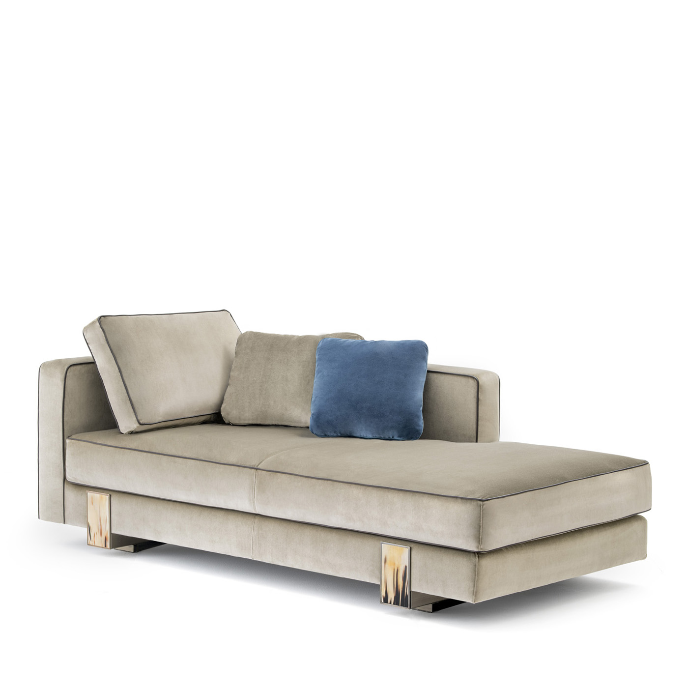 Featuring impeccable style and sublime comfort, the Adriano chaise longue will offer an instant air of elegance to any interior. Individually artisan made, the chaise longue is proposed in Lario velvet (cat. D), in a neutral color n. 23, but an array of sumptuous upholsteries is also available. Embellished by four feet in matte horn and burnished brass, this chaise longue is added a unique value and aesthetic going beyond time and fashion. The padding in multi density expanded polyurethane foam, goose down and memory foam offers an ultra-comfortable lounge experience.