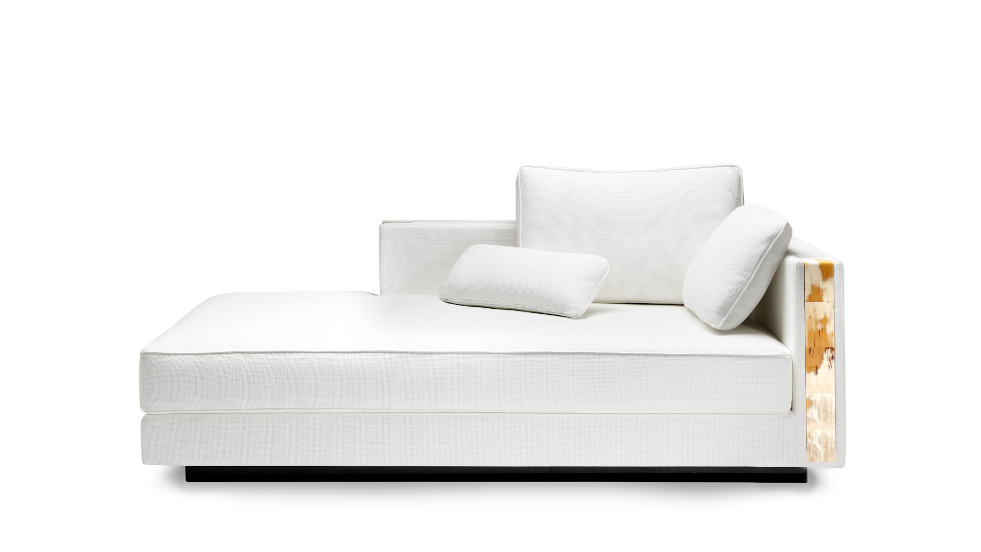 Pairing optimum sitting comfort with high-style, the Zeus chaise longue is perfect for bedrooms, studios or lounges. The design is proposed in a textured Grand Natté fabric (cat. A) in White colour. The chaise longue is distinguished by handcrafted L-shaped armrests in glossy light horn and its upholstery is customizable.