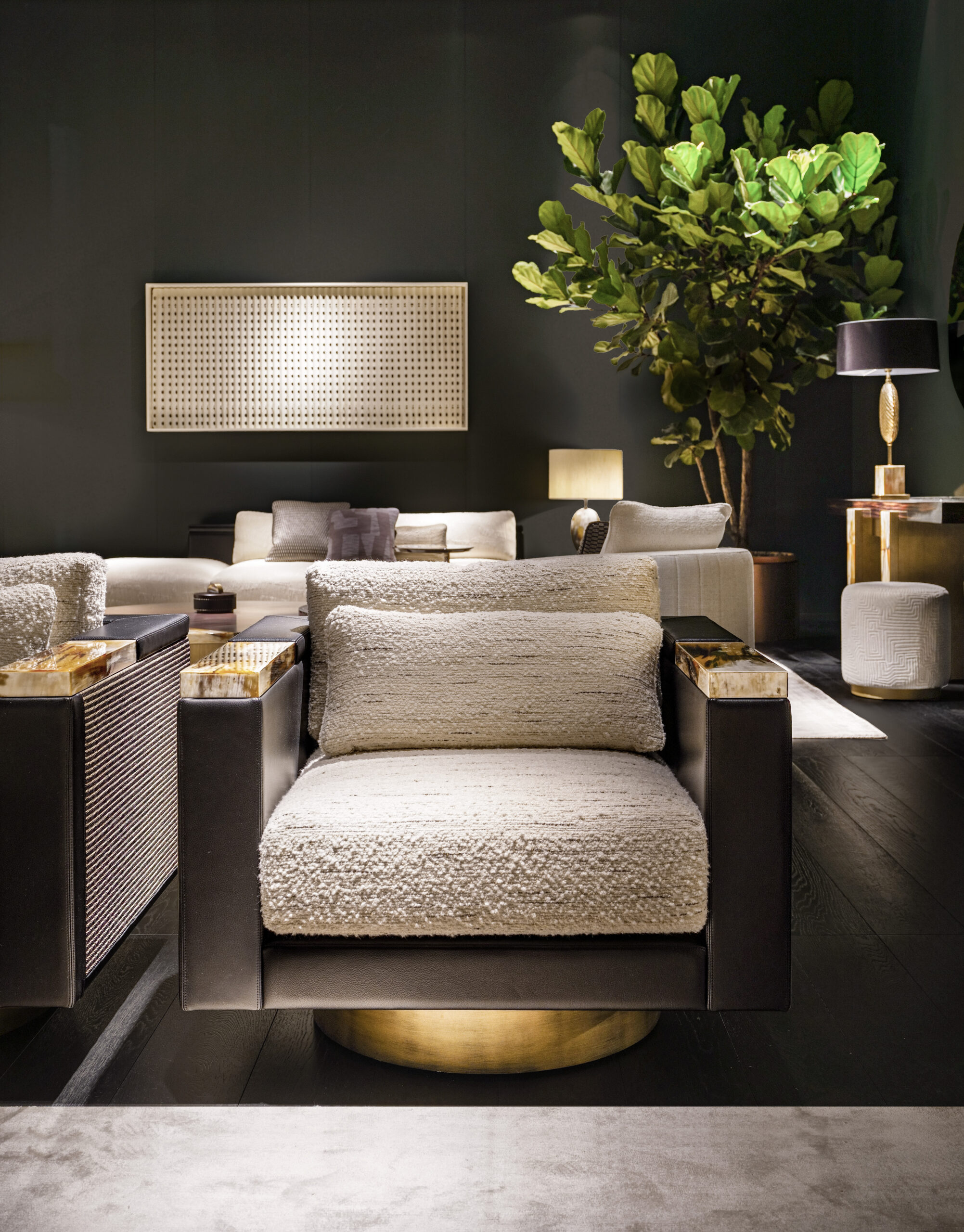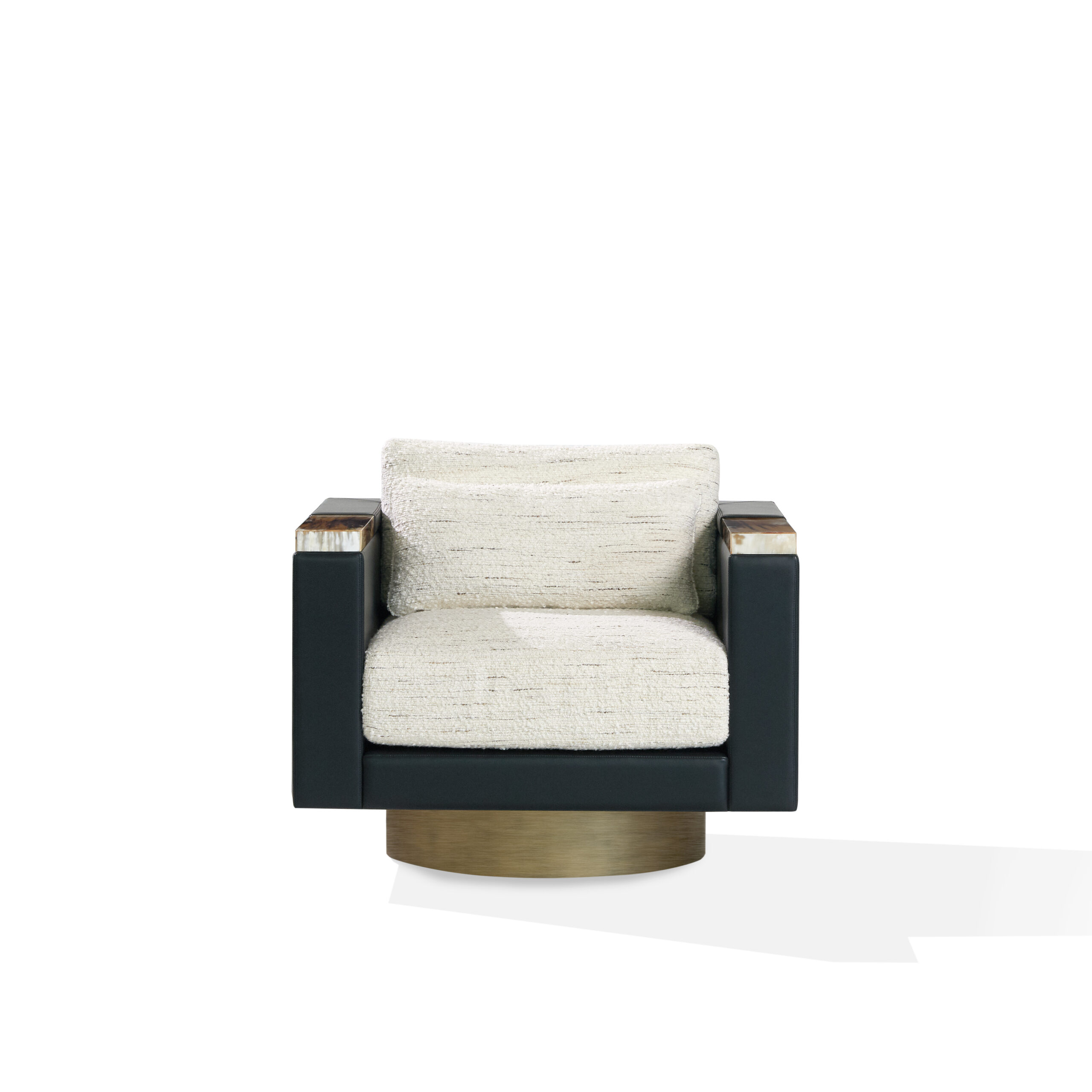The armrests are elevated by striking details in natural horn with a glossy finish. Each insert is the result of meticulous selection and masterful handcrafting, which honors the organic nature of the material and reveals its authentic beauty, transforming each piece into a one-of-a-kind creation. The circular base, crafted from lacquered wood with a burnished metal-effect finish, brings a sense of lightness and movement to the design. The padding, made of multi-density polyurethane foam and goose down, ensures enveloping, long-lasting comfort. A decorative goose-down cushion adds an extra layer of softness and indulgence.