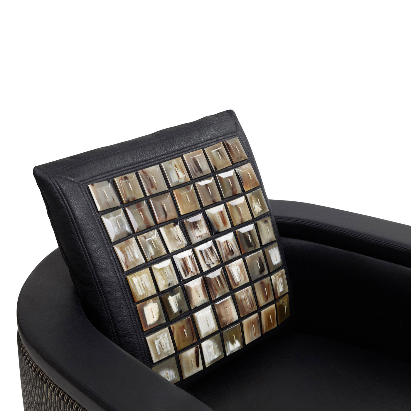 Armchair upholstered in Aida pebbled leather (cat. Super), Onyx colour. Structure upholstered in Kotakot fabric, black colour. Cushion in pebbled leather, Onyx colour with horn gems. Base in Aida pebbled leather (cat. Super), Onyx colour. Multi-density expanded polyurethane foam and goose down padding. Decorative cushion padded with goose down.