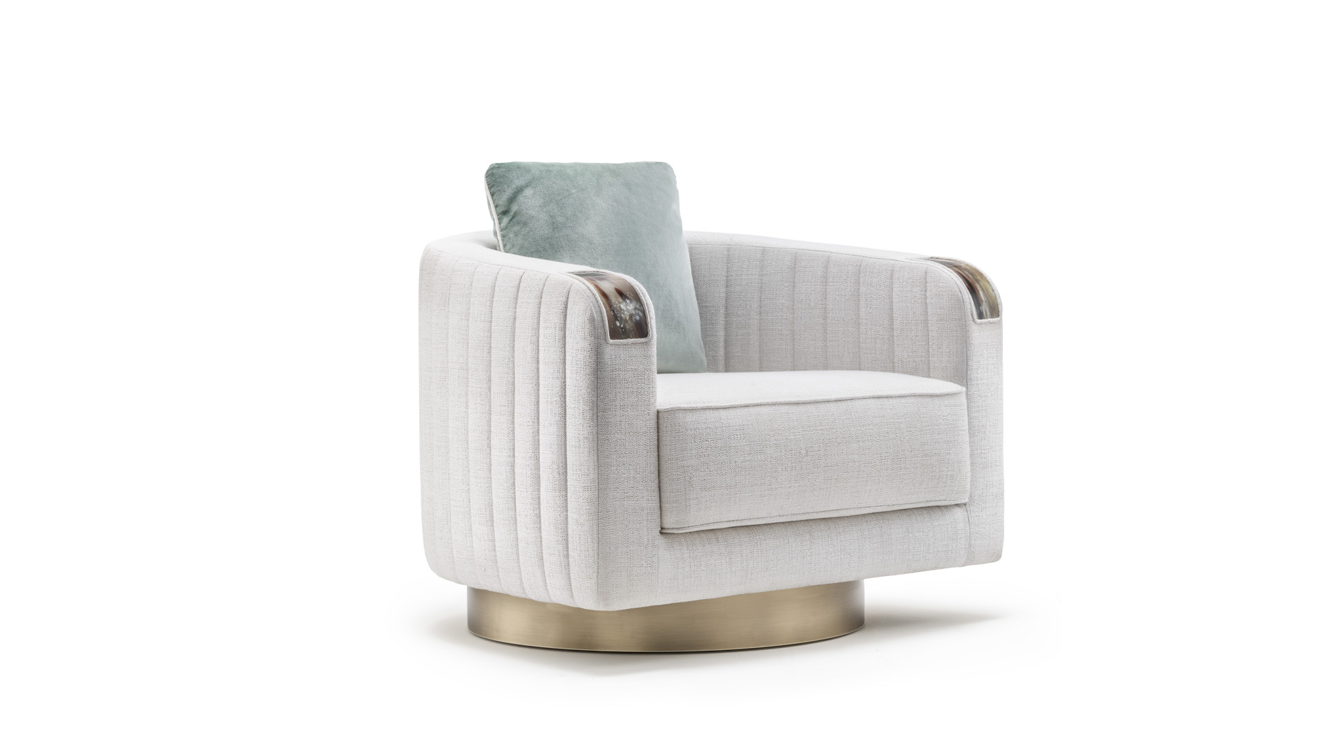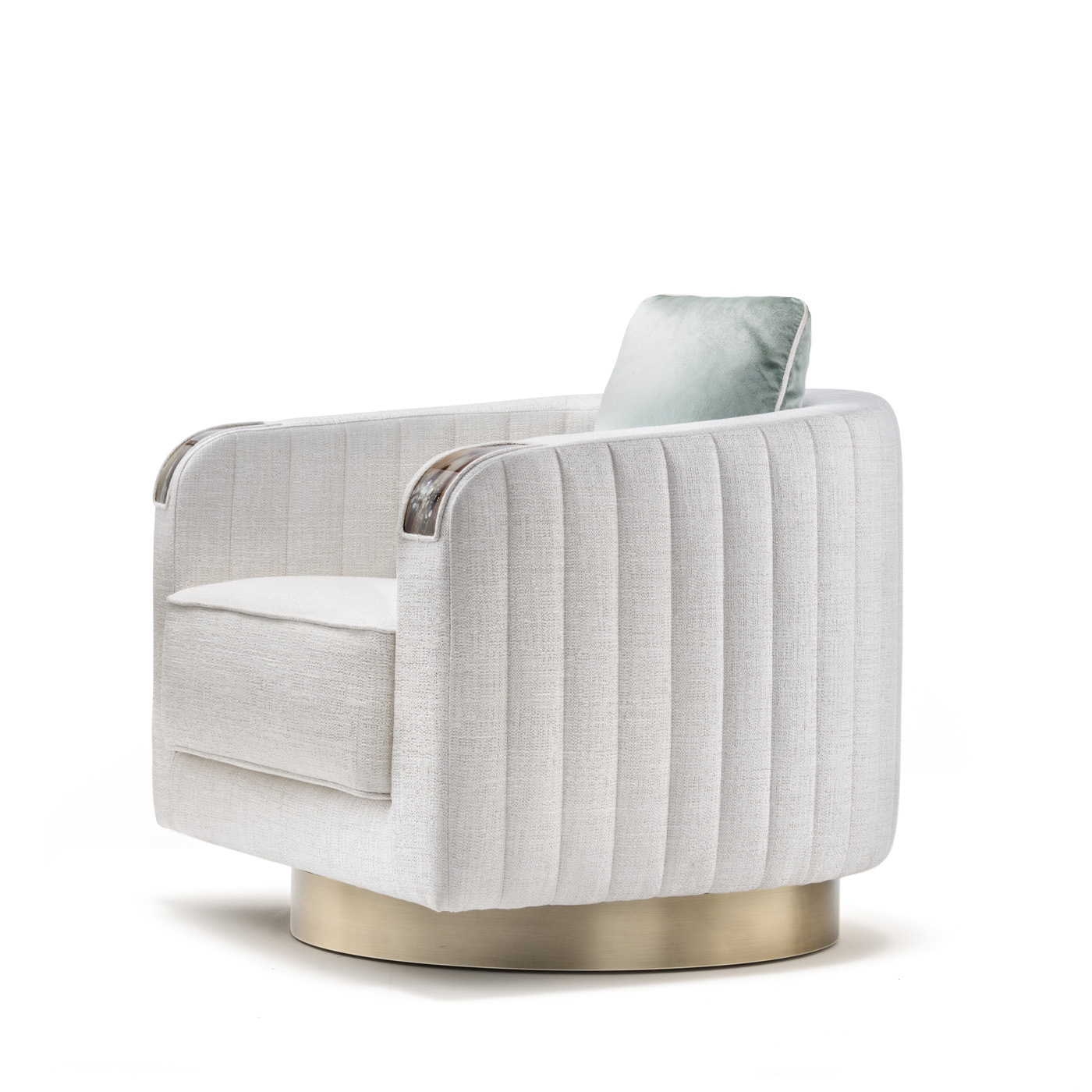 Swivel armchair in Sparks fabric (cat. B), white colour with curved arms in horn and base in wood with satin brass effect. Sides and back quilted with ribbed motif. Multi-density expanded polyurethane foam, goose down and memory foam padding.