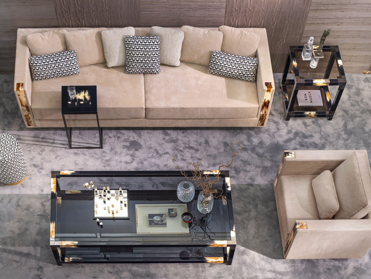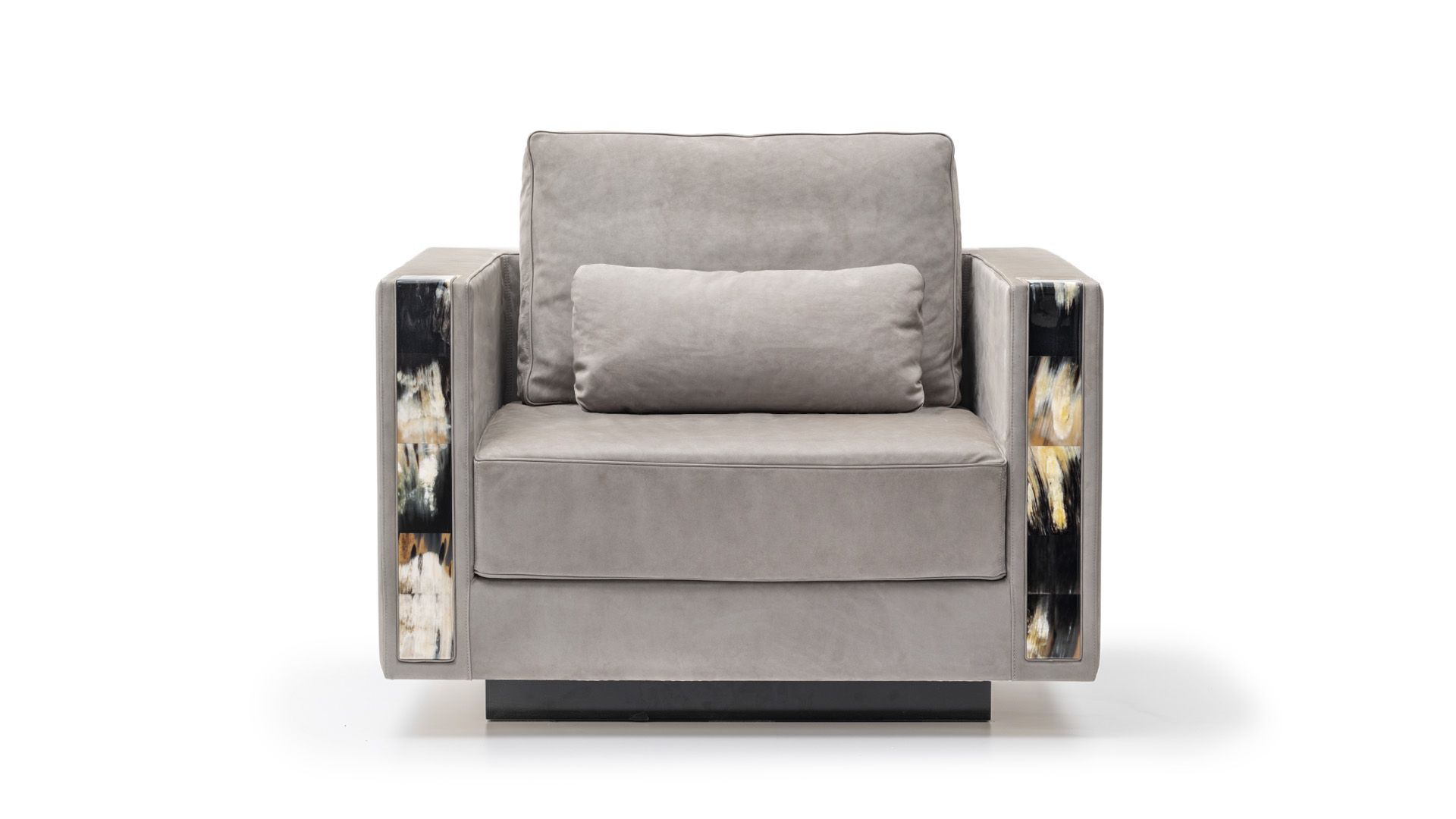 Exquisite and imposing, the Zeus armchair stands out for its contemporary style, generous proportions and great comfort. Standing upon a wooden base with a high-polished black finish, the design is proposed in premium grey Carmen nabuk leather (cat. Luxe), but different upholstery or COM options are available. The padding in multi-density expanded polyurethane foam, goose down and memory foam offers a refined relaxation. With highly distinctive dark horn inlays emphasizing its armrests, Zeus is a seating solution outside traditional canons which will bring great personality to any interior.