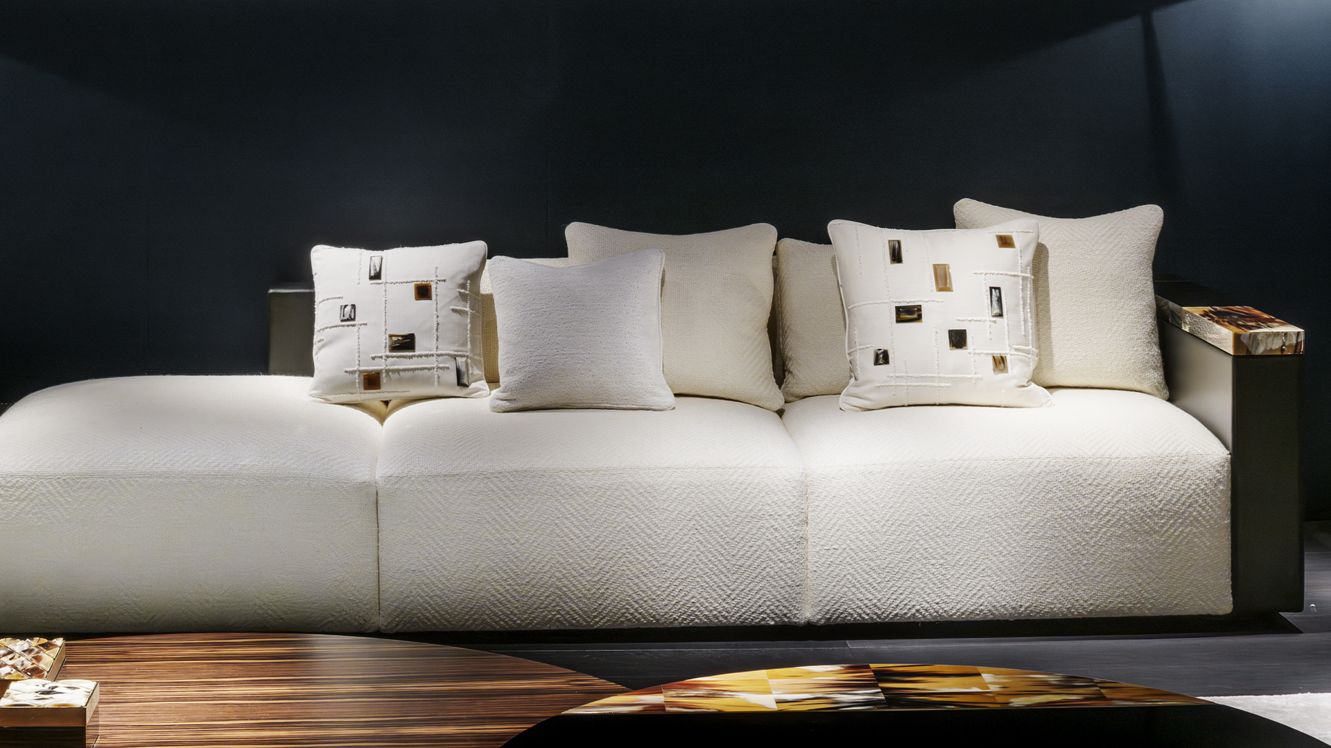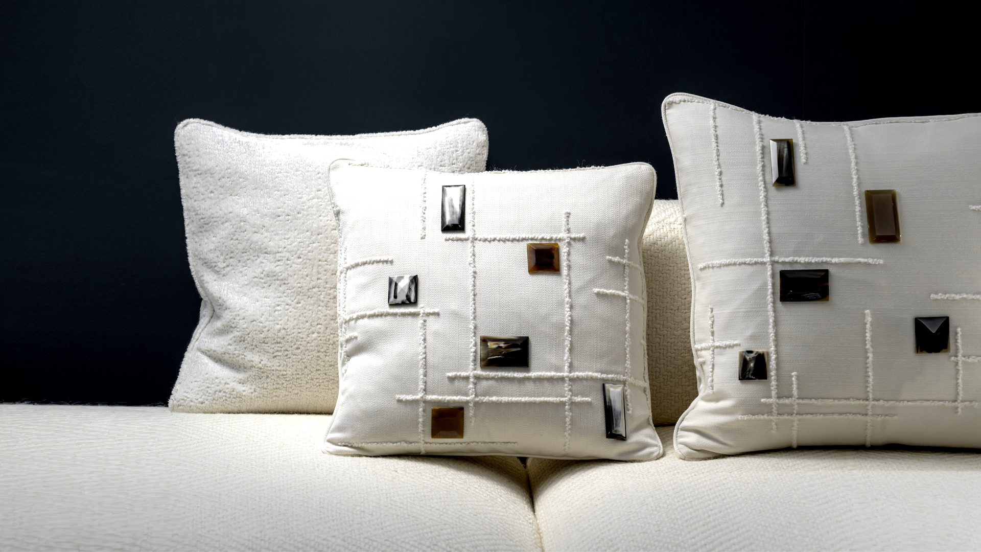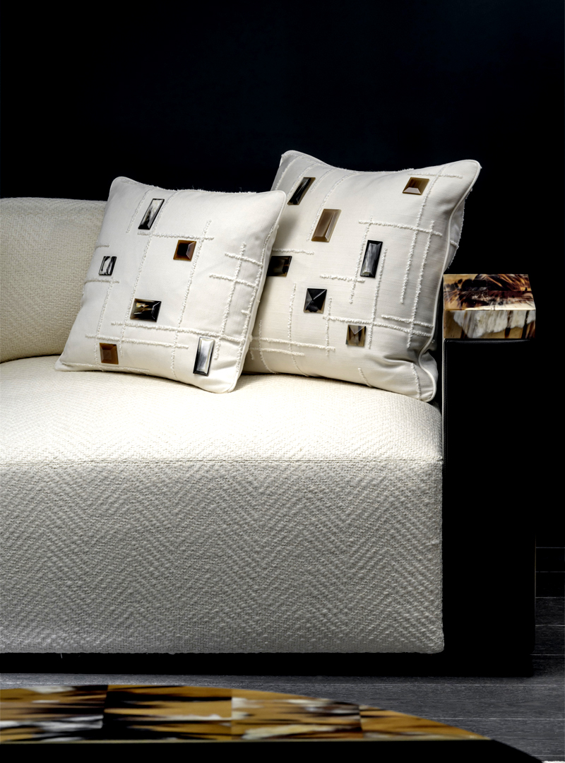 They are decorated with elegant details in 24k gold plated brass and horn, which is skillfully hand-shaped to recall precious gems and to enhance the intrinsic properties of raw material. The unprecedented combination of horn and fabric pays homage to the values ​​of excellent craftsmanship. Featuring a goose down padding, the Zoe cushions are available in the dimensions of 40×40 and 50×50 and will easily fit into any refined and contemporary setting.