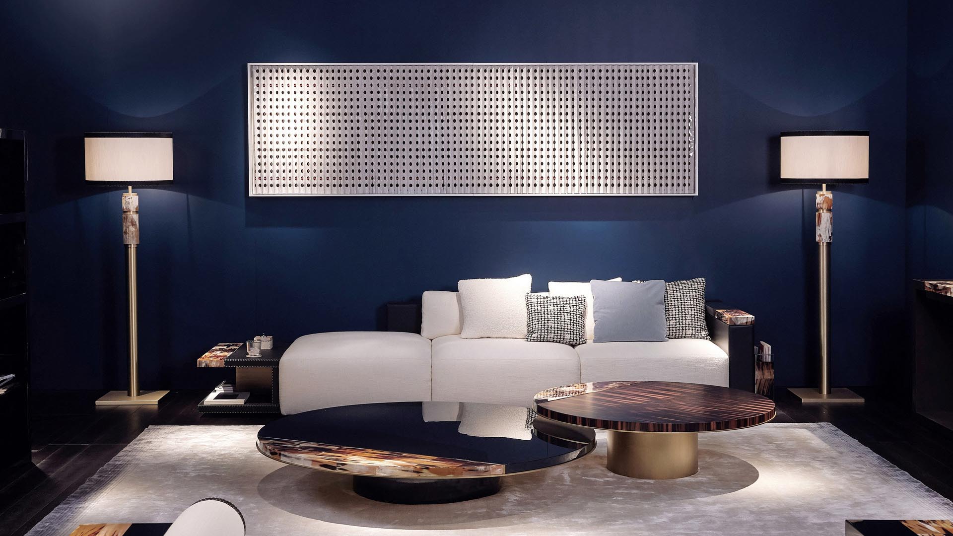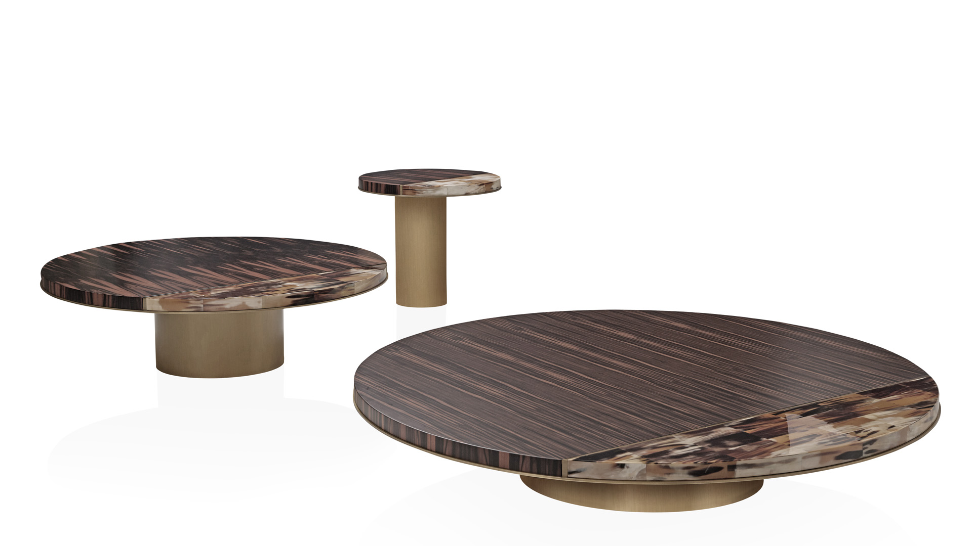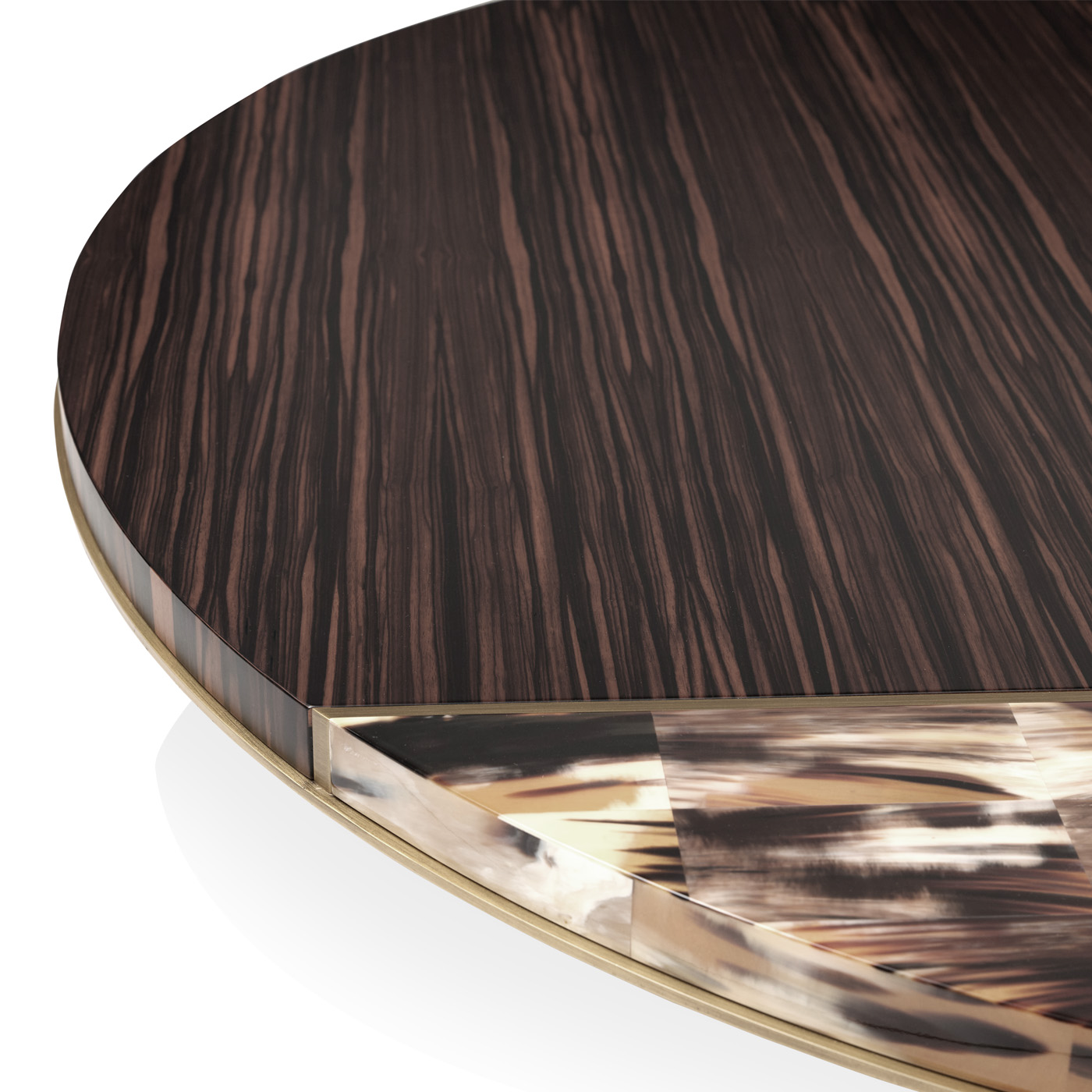 The circular shapes of the tops are cut by a half-moon insert in horn to create new geometries. The blending of evocative materials and the unrepeatable horn nuances lend a unique visual effect. All tables feature a monolithic base available in burnished brass or lacquered metal.