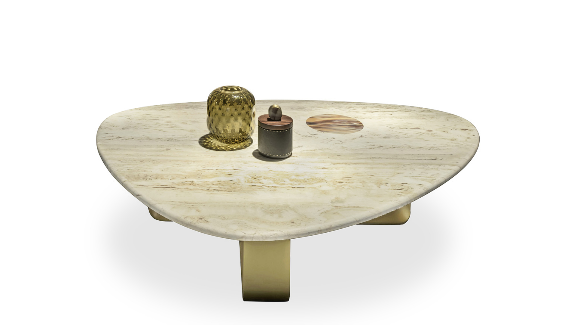 The coffee table is also available with the tabletop in Travertine and horn. Refined materials that are skillfully worked by expert craftsmen to turn Demetra into an exclusive furnishing piece for the most sophisticated environments. The neutral and delicate nuances of Travertine are combined with horn, whose elegant veins range from honey to dark brown color tones and create a suggestive effect that invites you to touch the surfaces and appreciate their natural textures. The tabletop rests on an elegant metal structure with satin finish. With its sinuous shapes and prized materials, Demetra is destined to conquer a leading role in the living area.