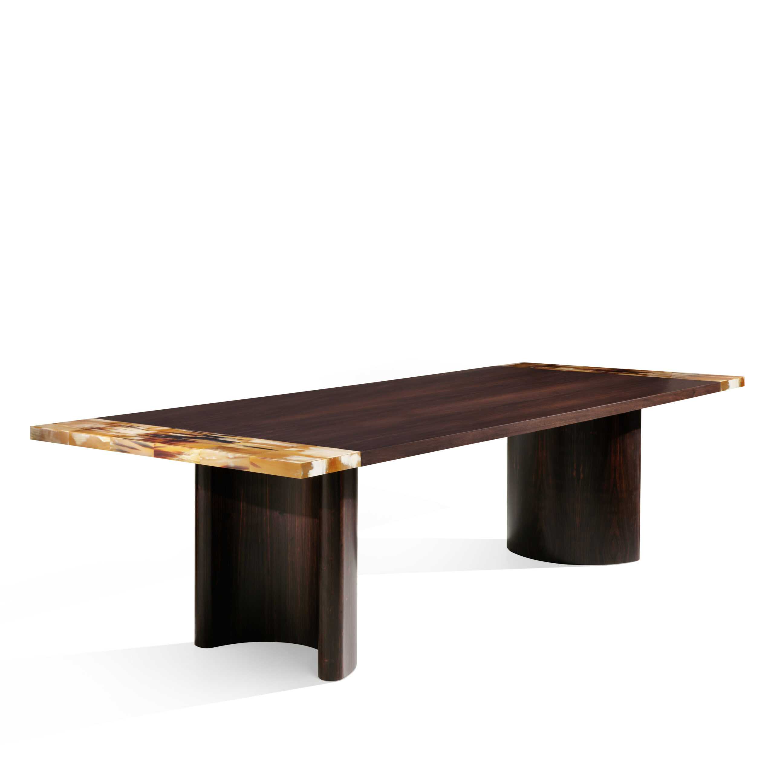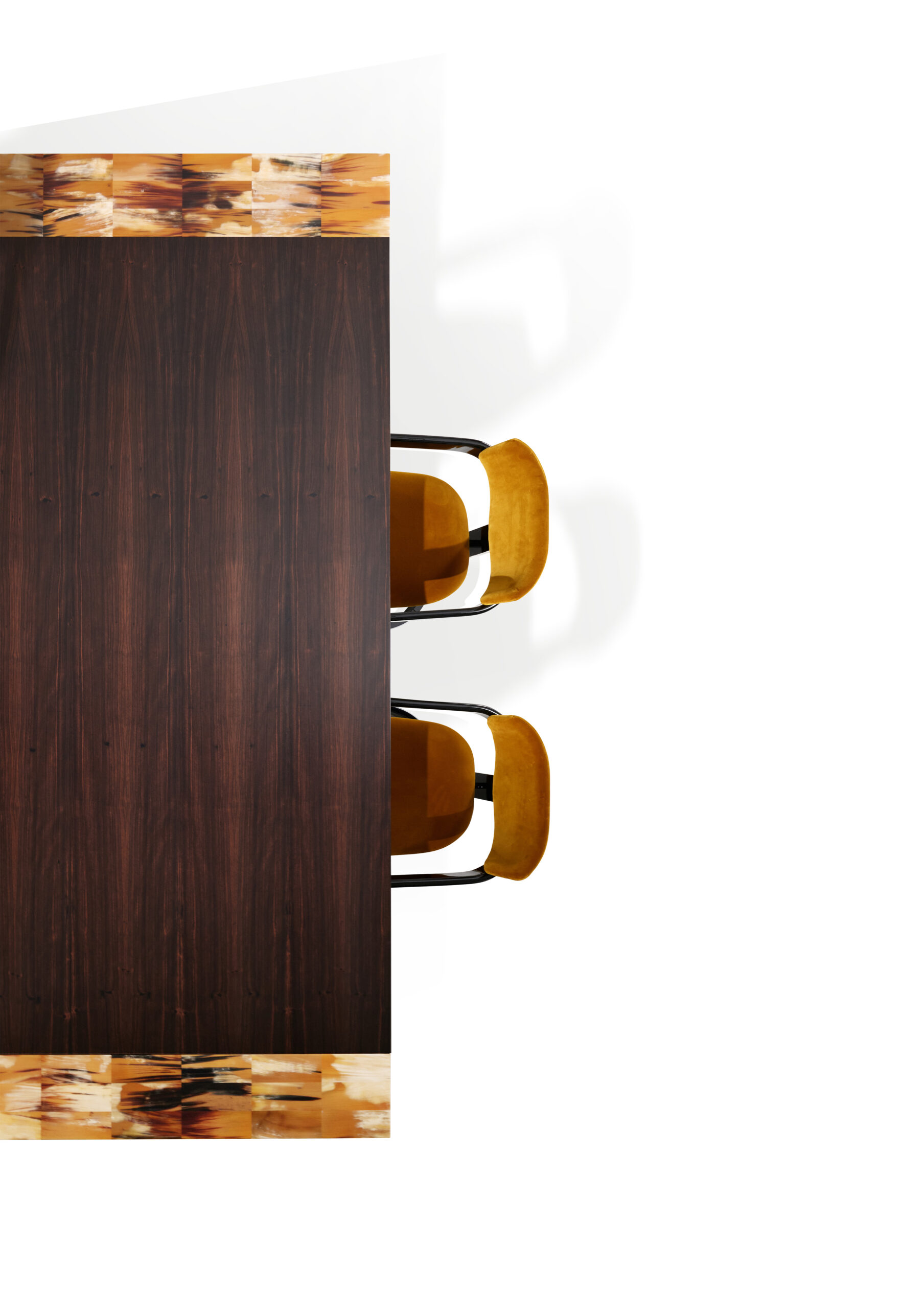 Tecla is a dining table that embodies elegant, contemporary lines and is expertly designed to create inviting and convivial spaces. Crafted from matte Amara ebony, the generous rectangular tabletop is enhanced by polished horn accents gracing its edges. The horn tiles are thoughtfully integrated into the design, showcasing a refined interplay of natural hues and contrasting finishes that catch the eye and elevate the table’s overall aesthetic.
